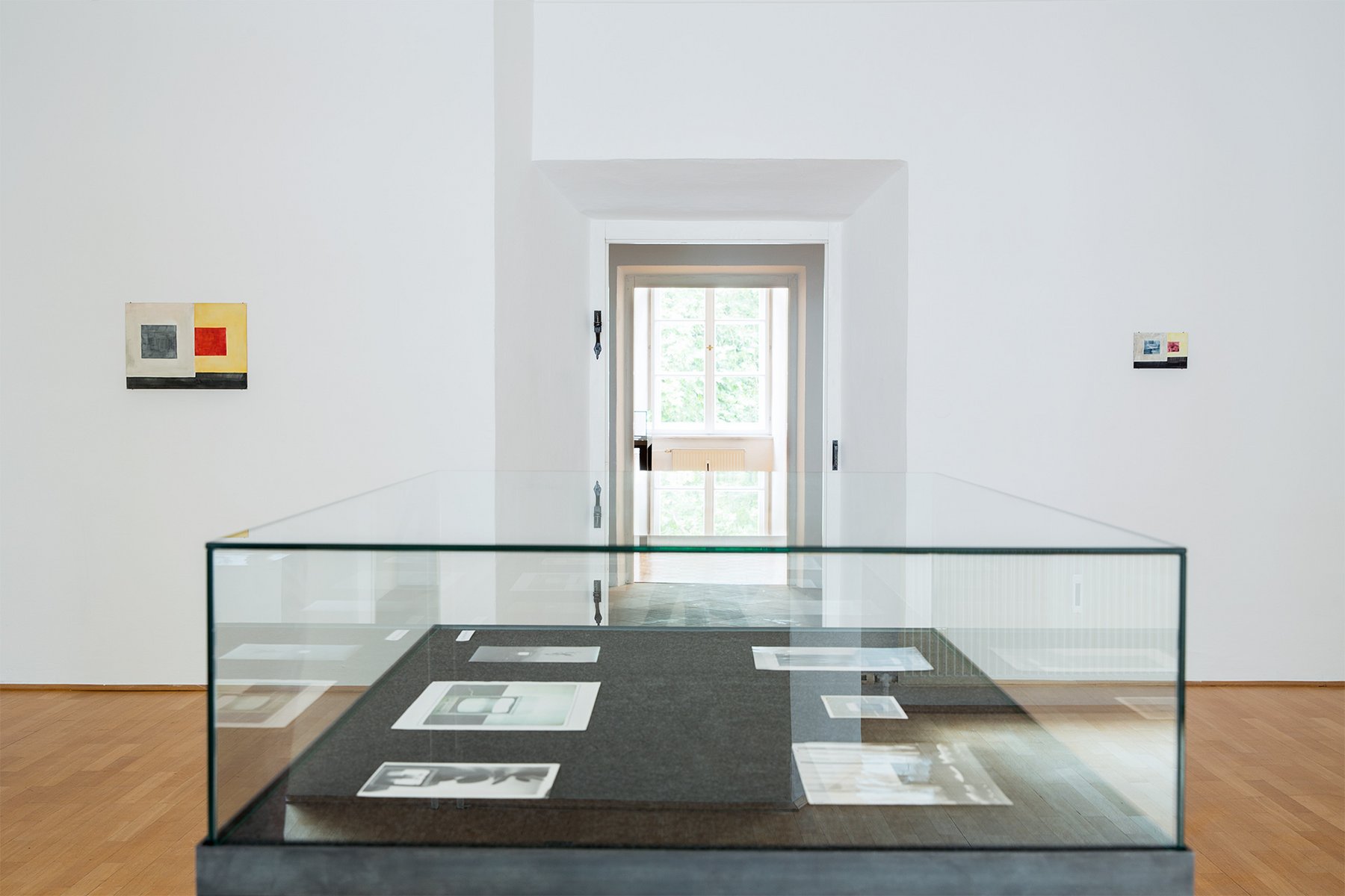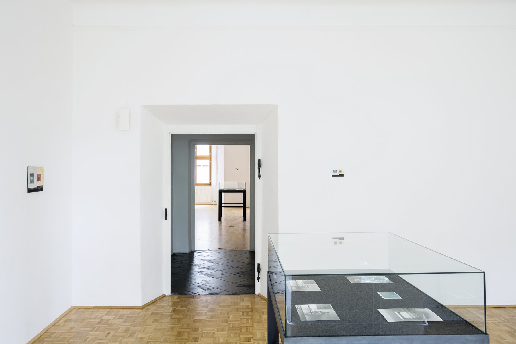 Andererseits präsentiert er in Vitrinen eine Serie von noch nie gezeigten Vintage-Fotografien, die wiederum seine frühen konzeptuellen Videoarbeiten dokumentieren. Was beide Serien eint, ist ihr verwirrendes Spiel mit Bild- und Raumillusionen, die sowohl seine Videoarbeiten als auch seine Papier- und Wandmalereien eröffnen. Hier wie dort schachteln sich die Räume ins Unendliche, überlagern sich real und virtuell, vergrößern und verkleinern sich.