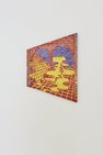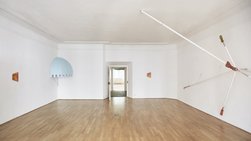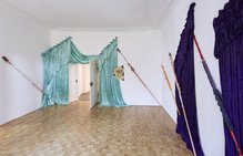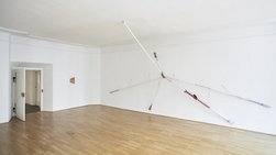 In Schwaz zeigt er neue Objekte und Zeichnungen, die sein in jüngster Zeit entwickeltes Vokabular weiter ausdifferenzieren. Lanzenartige Objekte, metallene Markisen und Draperien aus Pannesamt bilden Akteure in einem bühnenhaften Setting. Die Handlung ist obskur, aber bestimmt. Die zentrale Wand der Ausstellung wird von einer Art mehrarmigen Zeremonienmeister aus gedrechselten Stäben mit Handschuhen, die in alle Richtungen weisen, dominiert. Auch die Form dieses Wandobjekts selbst ist multiperspektivisch. Zeigt hier jemand mit Fingern auf andere oder wird versucht, einen entfernten Punkt zu berühren, die Distanz mit überlangen Armprothesen zu überbrücken? Sind es überhaupt gestikulierende Arme oder doch mittelalterlich anmutende Waffen, bzw. ihre gepolsterten Nachfahren aus zeitgenössischen Live Action Rollenspielen?