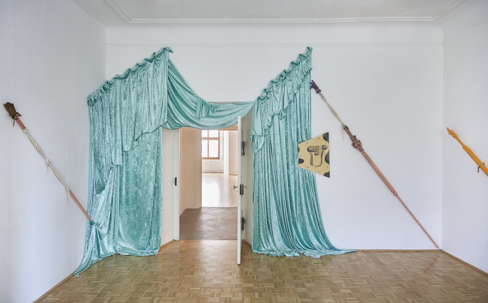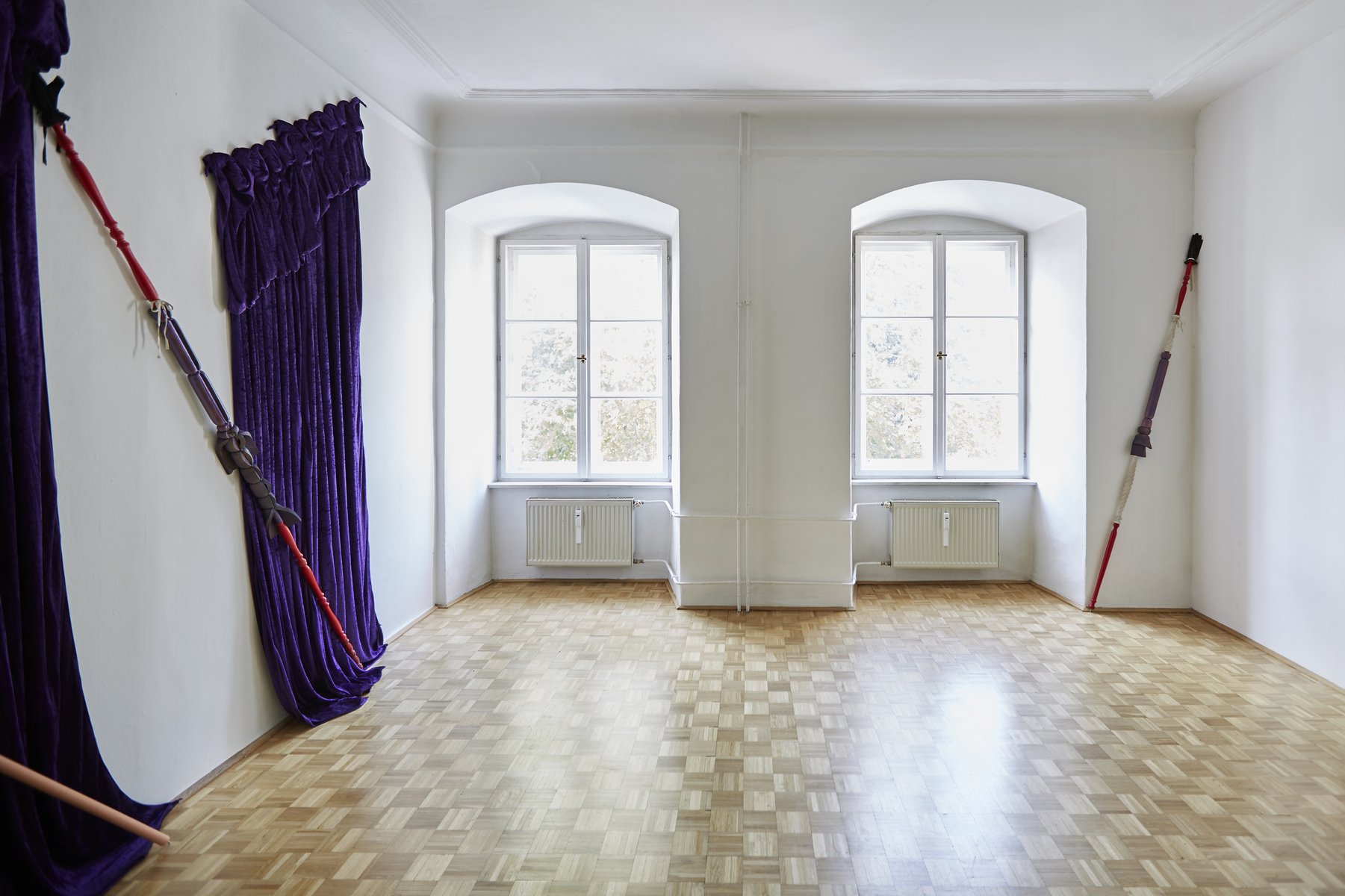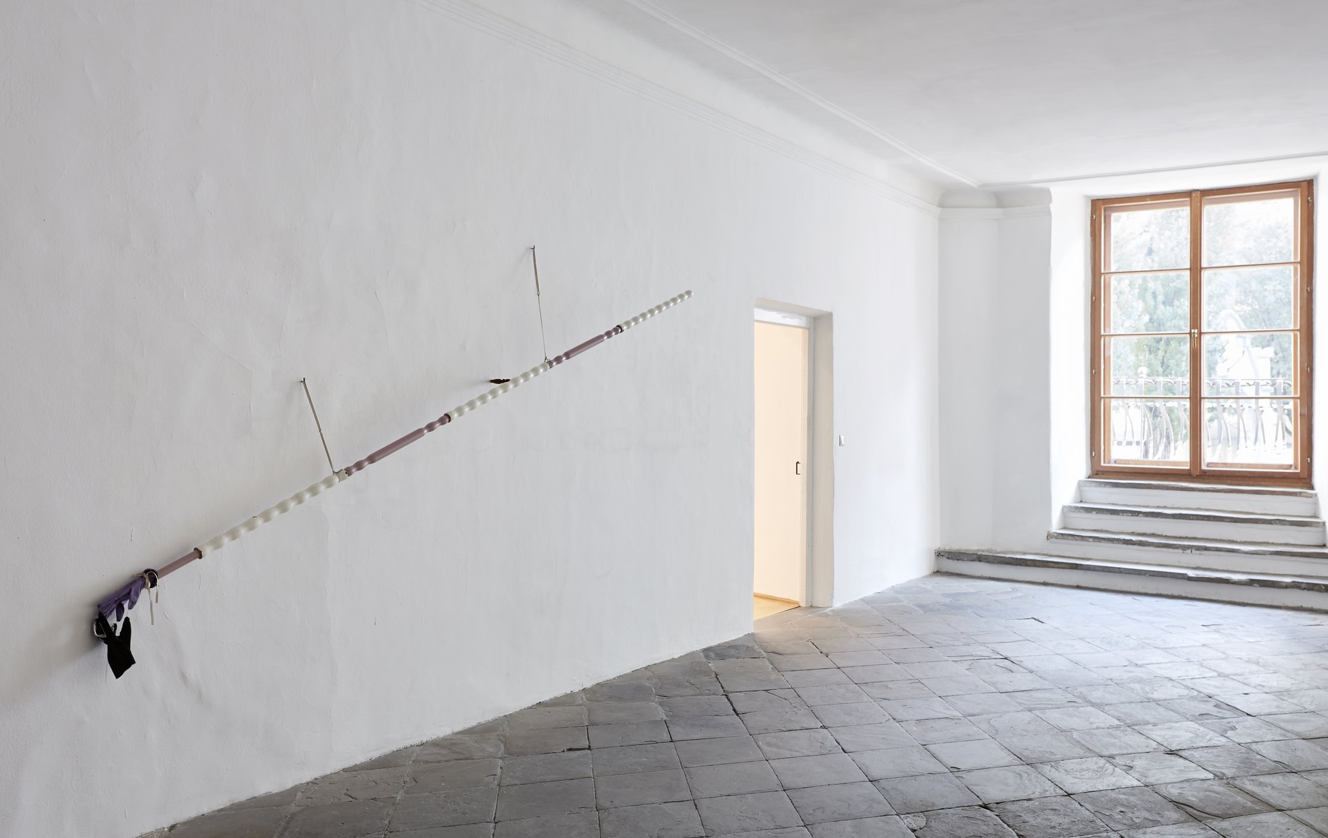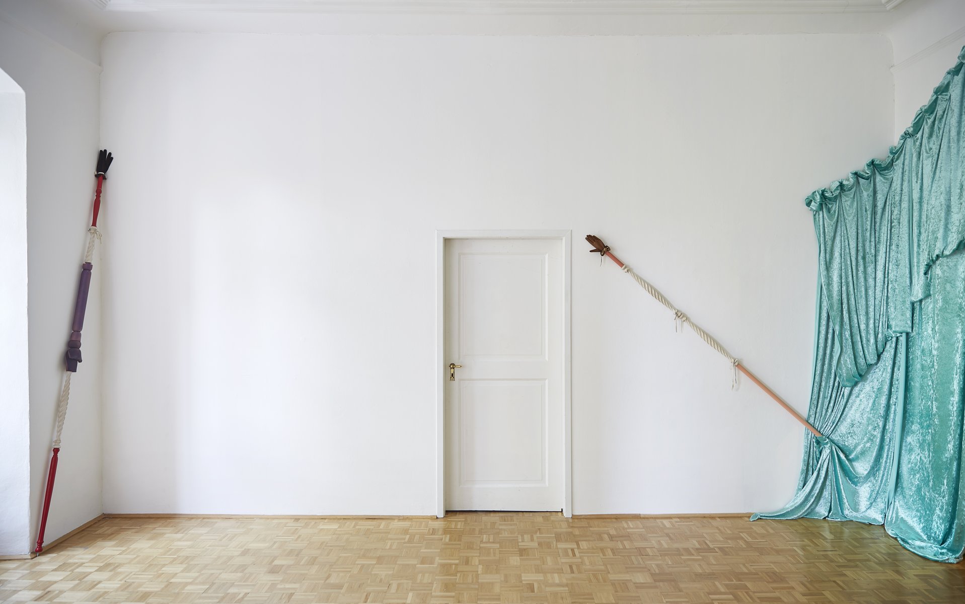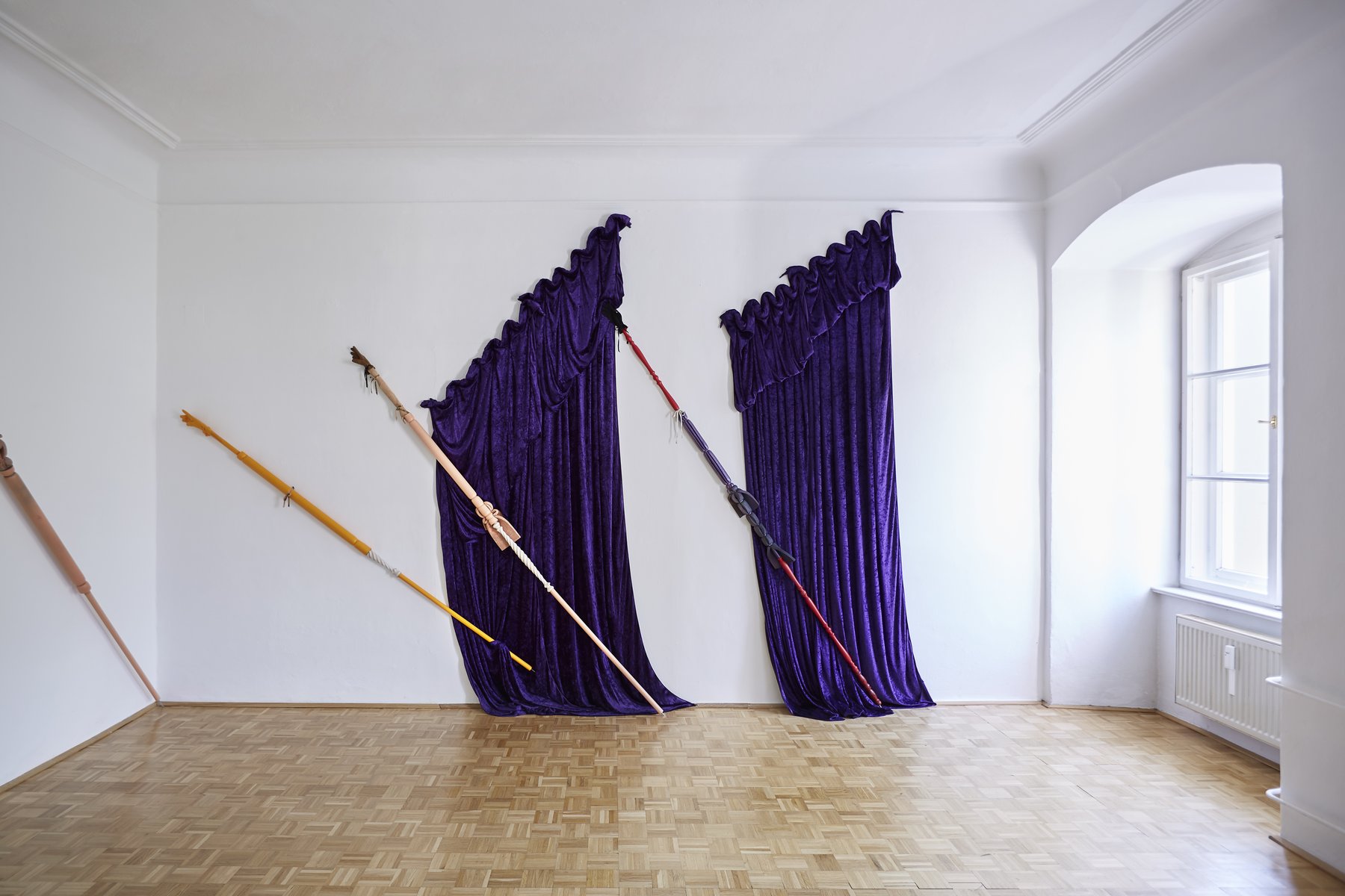 In Schwaz zeigt er neue Objekte und Zeichnungen, die sein in jüngster Zeit entwickeltes Vokabular weiter ausdifferenzieren. Lanzenartige Objekte, metallene Markisen und Draperien aus Pannesamt bilden Akteure in einem bühnenhaften Setting. Die Handlung ist obskur, aber bestimmt. Die zentrale Wand der Ausstellung wird von einer Art mehrarmigen Zeremonienmeister aus gedrechselten Stäben mit Handschuhen, die in alle Richtungen weisen, dominiert. Auch die Form dieses Wandobjekts selbst ist multiperspektivisch. Zeigt hier jemand mit Fingern auf andere oder wird versucht, einen entfernten Punkt zu berühren, die Distanz mit überlangen Armprothesen zu überbrücken? Sind es überhaupt gestikulierende Arme oder doch mittelalterlich anmutende Waffen, bzw. ihre gepolsterten Nachfahren aus zeitgenössischen Live Action Rollenspielen?