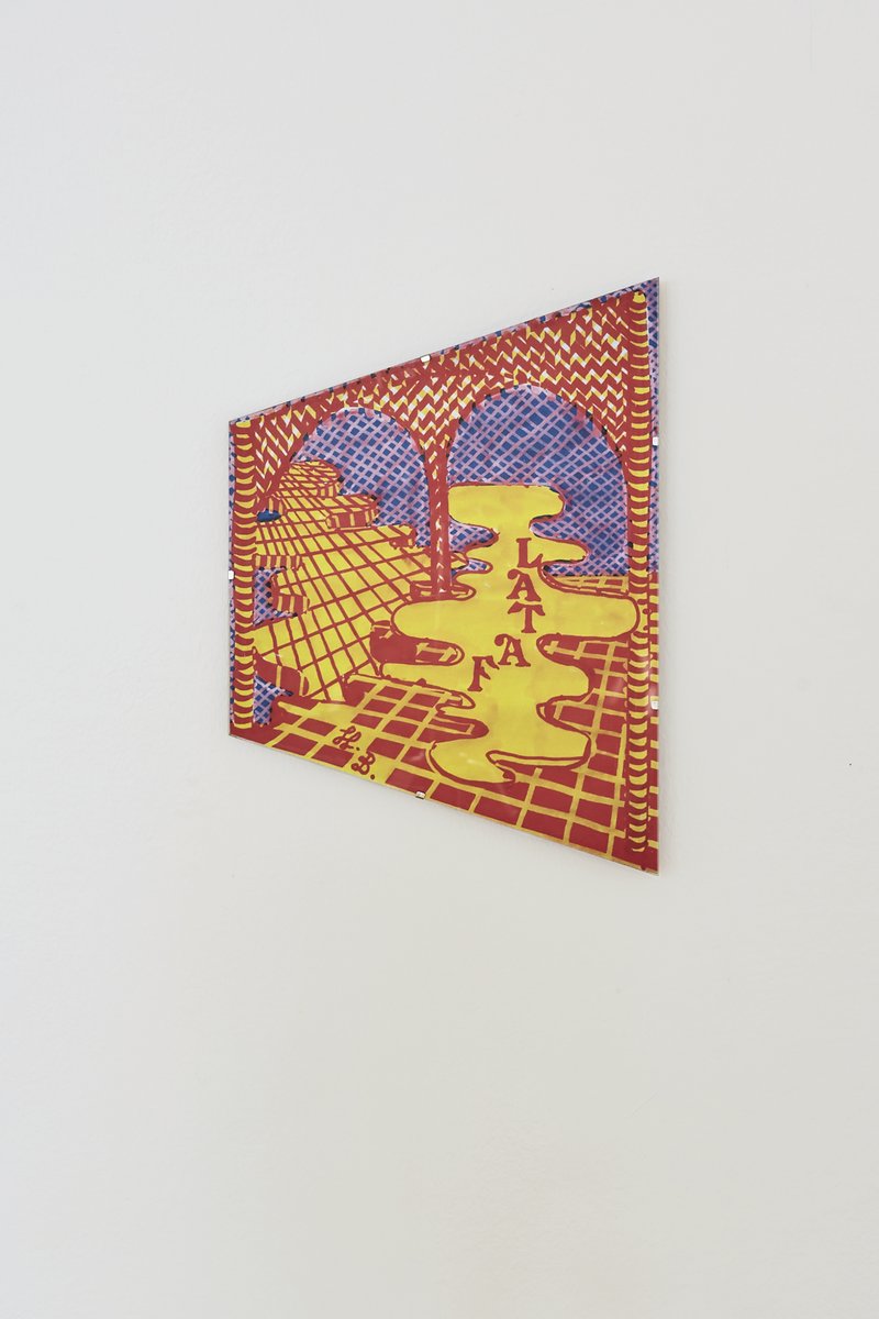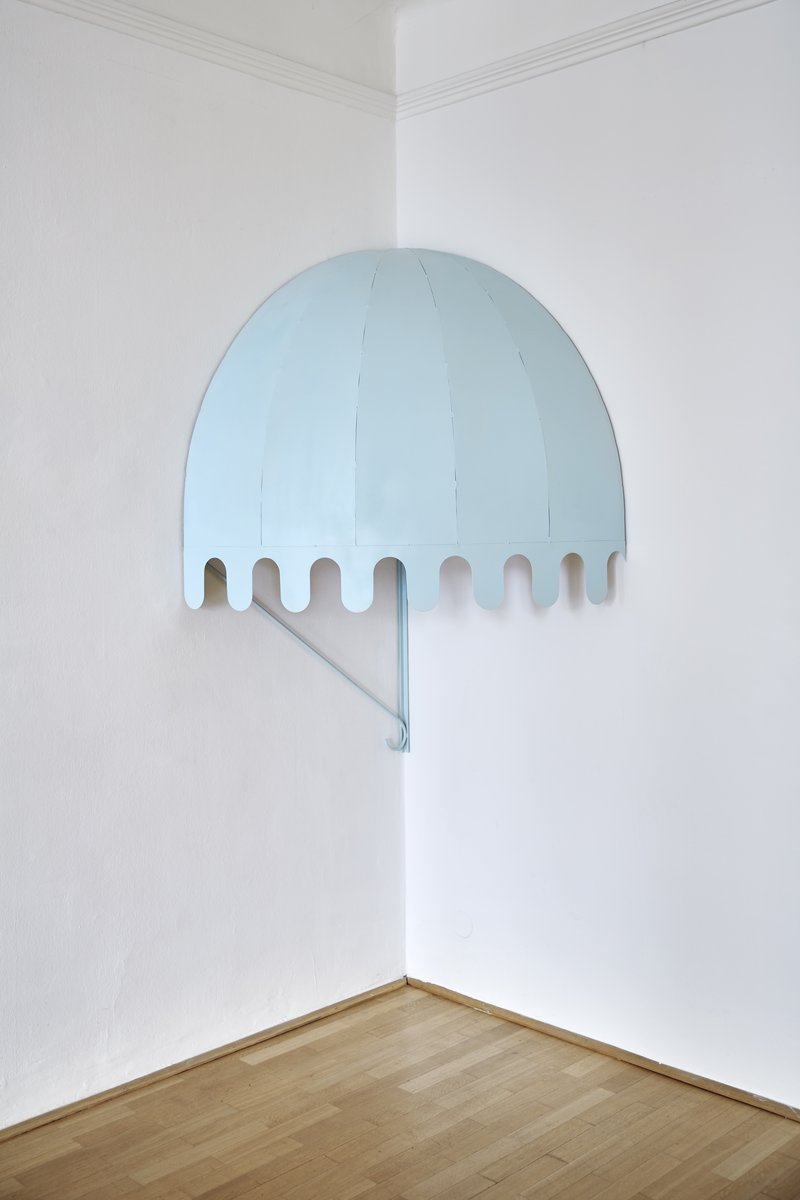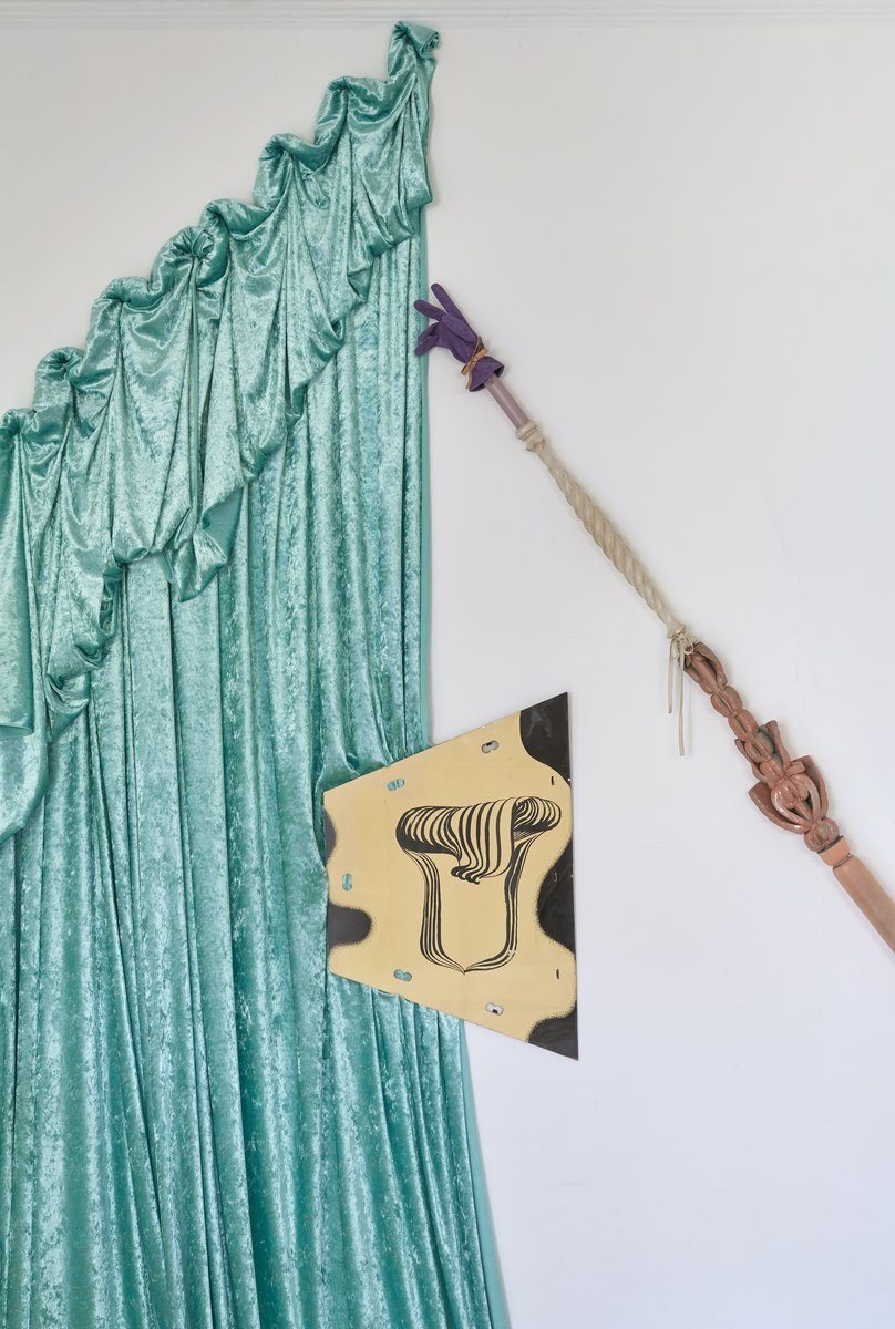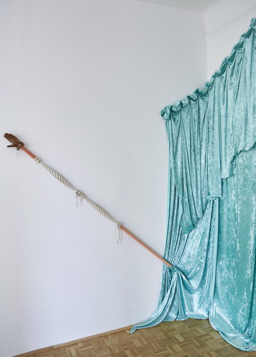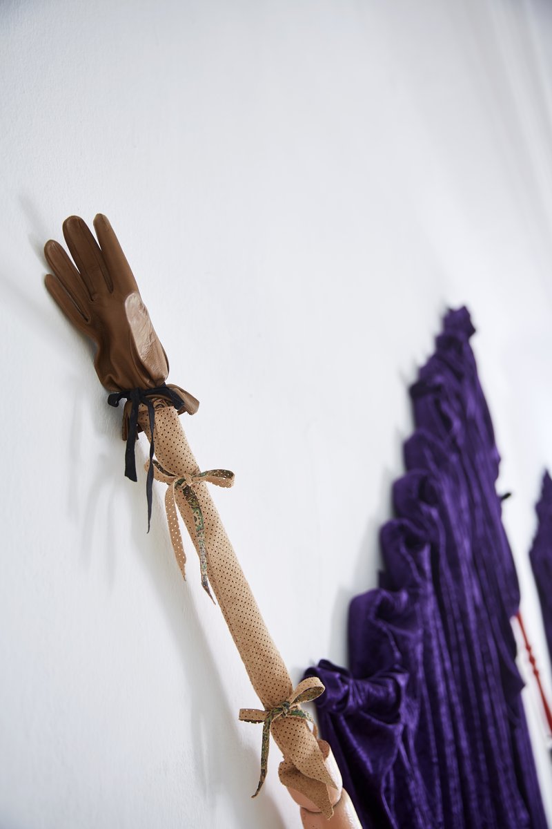 In Schwaz zeigt er neue Objekte und Zeichnungen, die sein in jüngster Zeit entwickeltes Vokabular weiter ausdifferenzieren. Lanzenartige Objekte, metallene Markisen und Draperien aus Pannesamt bilden Akteure in einem bühnenhaften Setting. Die Handlung ist obskur, aber bestimmt. Die zentrale Wand der Ausstellung wird von einer Art mehrarmigen Zeremonienmeister aus gedrechselten Stäben mit Handschuhen, die in alle Richtungen weisen, dominiert. Auch die Form dieses Wandobjekts selbst ist multiperspektivisch. Zeigt hier jemand mit Fingern auf andere oder wird versucht, einen entfernten Punkt zu berühren, die Distanz mit überlangen Armprothesen zu überbrücken? Sind es überhaupt gestikulierende Arme oder doch mittelalterlich anmutende Waffen, bzw. ihre gepolsterten Nachfahren aus zeitgenössischen Live Action Rollenspielen?