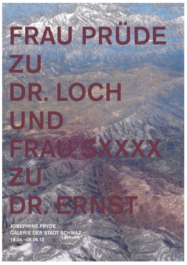 Die Verbindung zwischen den Arbeiten entsteht durch die Zeit. In mancher Hinsicht kann Frau Prüde zu Dr. Loch und Frau SXXXX zu Dr. Ernst als die retrospektivste der drei Ausstellungen gesehen werden, die Josephine Pryde seit Februar 2012 im Kunstverein für die Rheinlande und Westfalen und in der Kunsthalle Bern und nun in der Galerie der Stadt Schwaz gezeigt hat.