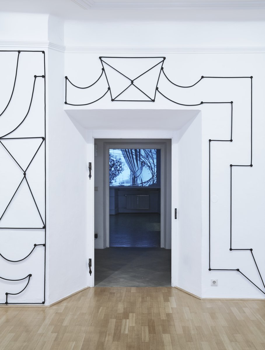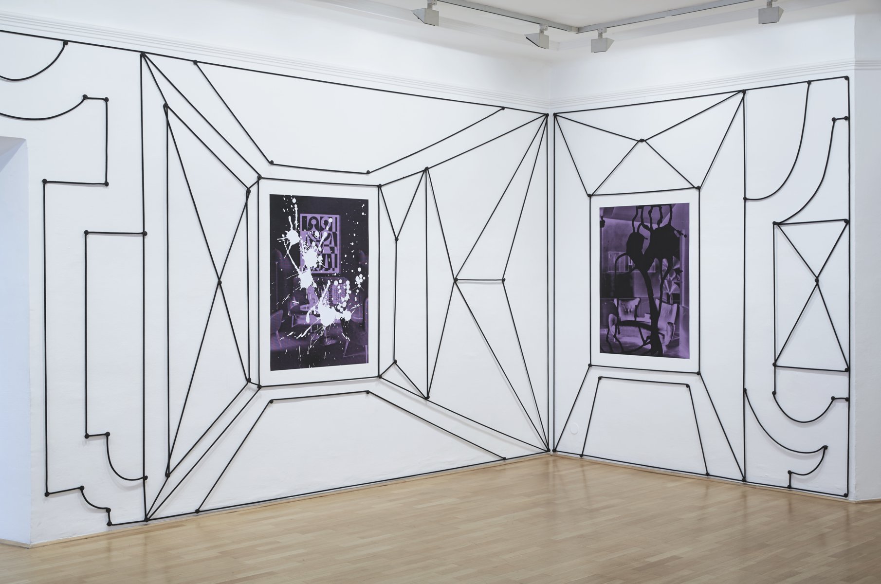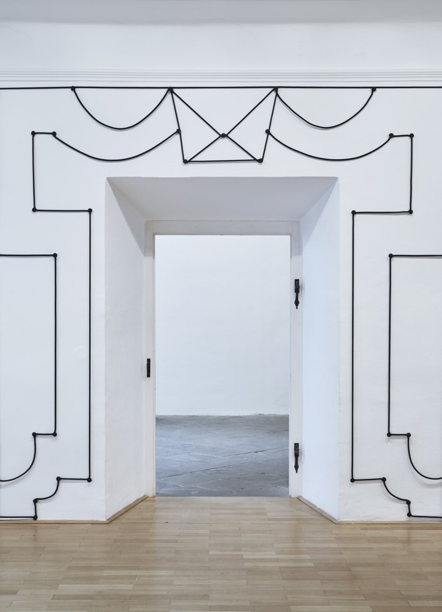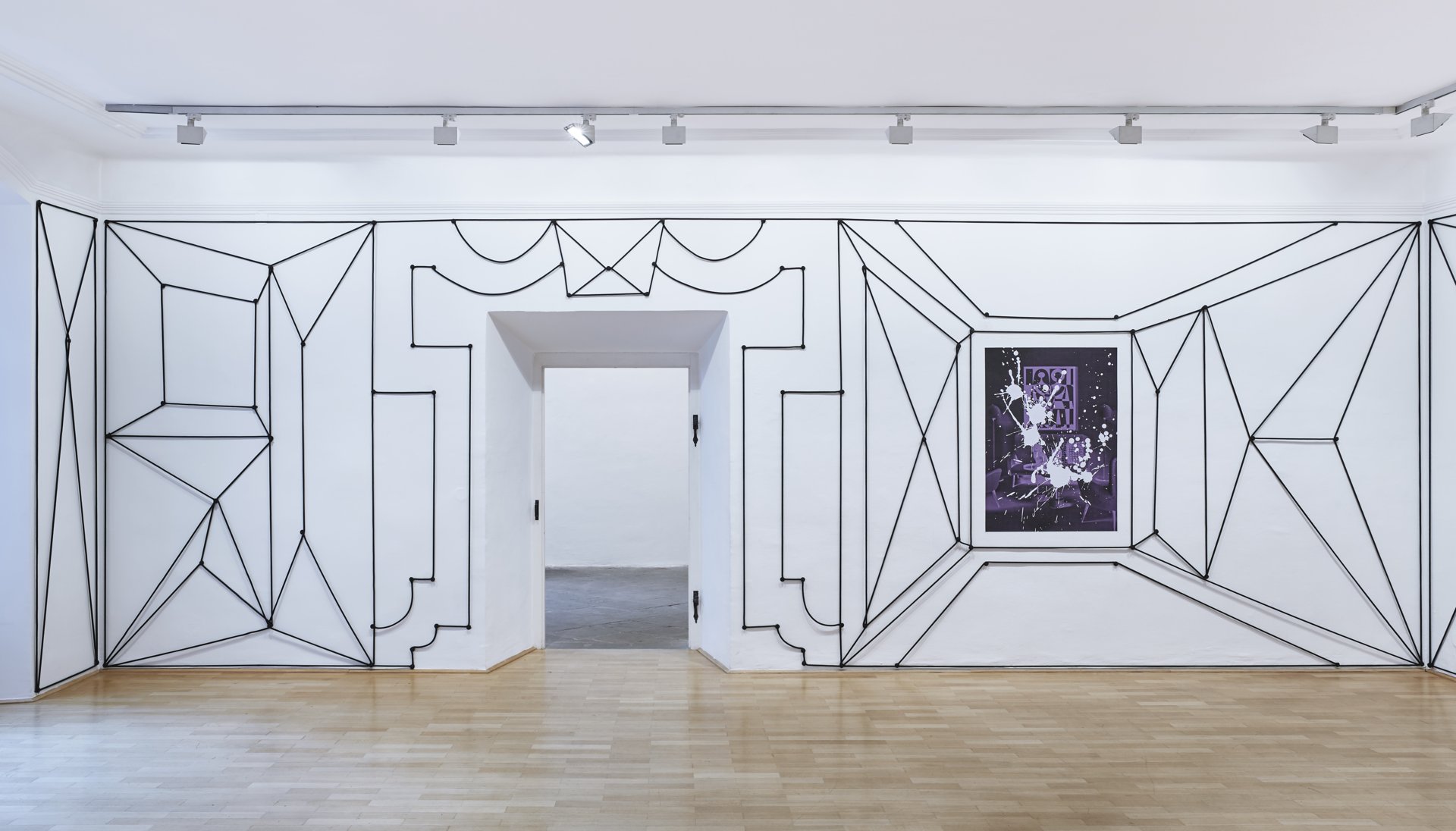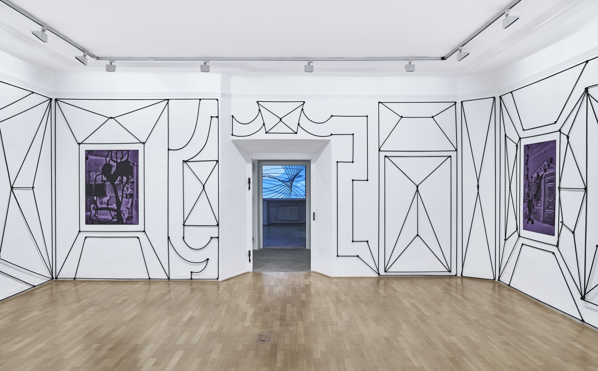Eine Linie drückt Bewegung aus. Sie verbindet zwei Punkte und sie teilt Felder beziehungsweise Terrains ab. Sie markiert eine Bühne, eine Projektionsfläche und trennt zwischen Szene und Publikum, Real- und Illusionsraum. Julian Göthe hält diese Grenze zwischen Realität und Fiktion jedoch durchlässig. Seine Arbeiten, Zeichnungen, wie Skulpturen und Installationen schalten zwischen den Medien und zwischen Zwei- und Dreidimensionalität hin und her. Der Berliner Künstler und Professor für Bildhauerei in Wien ist bekannt für seine Wandverspannungen. Auch in der aktuellen Ausstellung in Schwaz zieht Julian Göthe mit Polyesterseilen einen alternativen Raum ein. Seine Seilzeichnungen strukturieren die weiße Wandfläche, anders jedoch als das gleichgültige Grid der Moderne. Sie lenken vielmehr den Blick auf Stellen von besonderer Anziehungskraft, ausgewiesene Flächen, Öffnungen und angedeutet opulente Rahmen, die den Kontext für eine Reihe von Postern schaffen, für andere Räume, in die sich die Betrachter_innen als Teil der gesamten Inszenierung hinein imaginieren können. Distanzierungsmomente sind die digitalisierten Drippings, die die Interieurs auf den Postern als eigene Bereiche ausweisen. Es sind keine privaten Raumvisionen, sondern Innenausstattungen von Designern, wie etwa Jean-Michel Frank, die ihre Entwürfe in ihrem Verhältnis zur Gesellschaft zur Diskussion stellen. Die Seilzeichnungen und Raumansichten lassen gewissermaßen die Wände sprechen, weil sie diese auf ausgedehntere Horizonte hin öffnen, als sie die heteronormative Gesellschaft bereithält. Dieses Freiheitsversprechen belässt Göthe allerdings weitgehend in einer Welt der Projektionen, in einem Begehrenskontext, der nicht wieder durch neue Regularien verfestigt werden soll. „Walls Talk“ heißt der Film, der im Kabinett der Galerie gezeigt wird und komplementär zu der Installation im Hauptraum gelesen werden kann. Es ist eine anderthalbstündige Abfolge von Bildmaterial im Kinoformat aus Göthes Universum: Setdesign, barocke Festarchitekturen, Kunst- und Designgeschichte und Musik. Davor schwingen und tänzeln Linienformationen im Rhythmus der Sounds. Sie formen mit manchmal (un)heimlicher Neugierde Bögen und Kringel, gleiten über Wölbungen, schmiegen sich an Elemente, als ginge es um die Entschlüsselung eines sozialen Codes, nur um sich wieder vom nächsten Objekt zu neuen Formen inspirieren zu lassen. Wie Staffagefiguren oder Conférenciers führen sie ins Bildgeschehen ein. Manchmal bilden sie eine Art Vorhang, der am linken Bildrand beiseite gezogen wird, um eine Szene freizugeben. Spielerisch umschmeicheln sie die aus Büchern und Designmagazinen kopierten Ansichten von Repräsentations- und Bühnenarchitekturen, extravaganten Dekors, Fotografien und Filmen. Häufig sind dies Treppen, Faltenwürfe, Rocaillen, hoch aufgerichtete Monumente und muskulöse Körper von Bodybuildern oder auf manieristischen Kupferstichen, beispielsweise von Hendrik Goltzius, die sanft von der Kamera erfasst, nahezu abgetastet werden. Diese Zooms ins Bild eröffnen uns einen differenzierten Blick auf Details, die im Kanon der Kunst wenig Beachtung fanden. Im Verbund mit der Kamera und damit mit dem Auge des Betrachters/der Betrachterin verfolgen, überschneiden oder blocken die geschmeidigen Linien einzelne Bildelemente, aber sie berühren sie nie. Sie bleiben immer in ihrer eigenen vorgeblendeten Sphäre. Die Welt, die Julian Göthe generös mit uns teilt, wird auf einer ästhetischen Ebene verhandelt, die Ambivalenzen zulässt und gerade deshalb das Potential hat etwas zu verändern ohne dogmatisch zu werden.