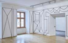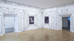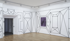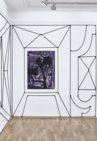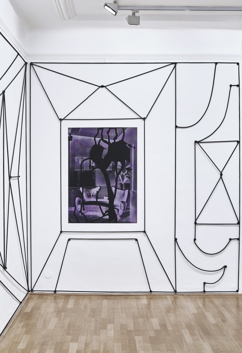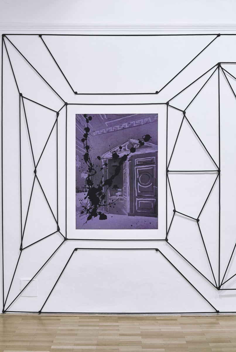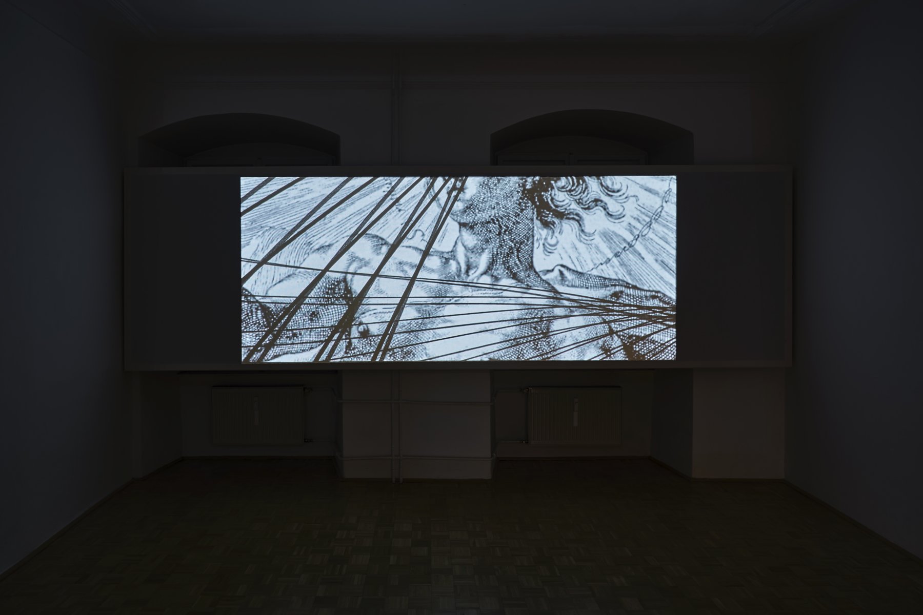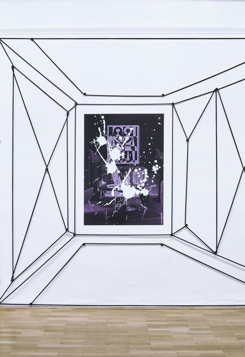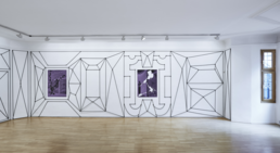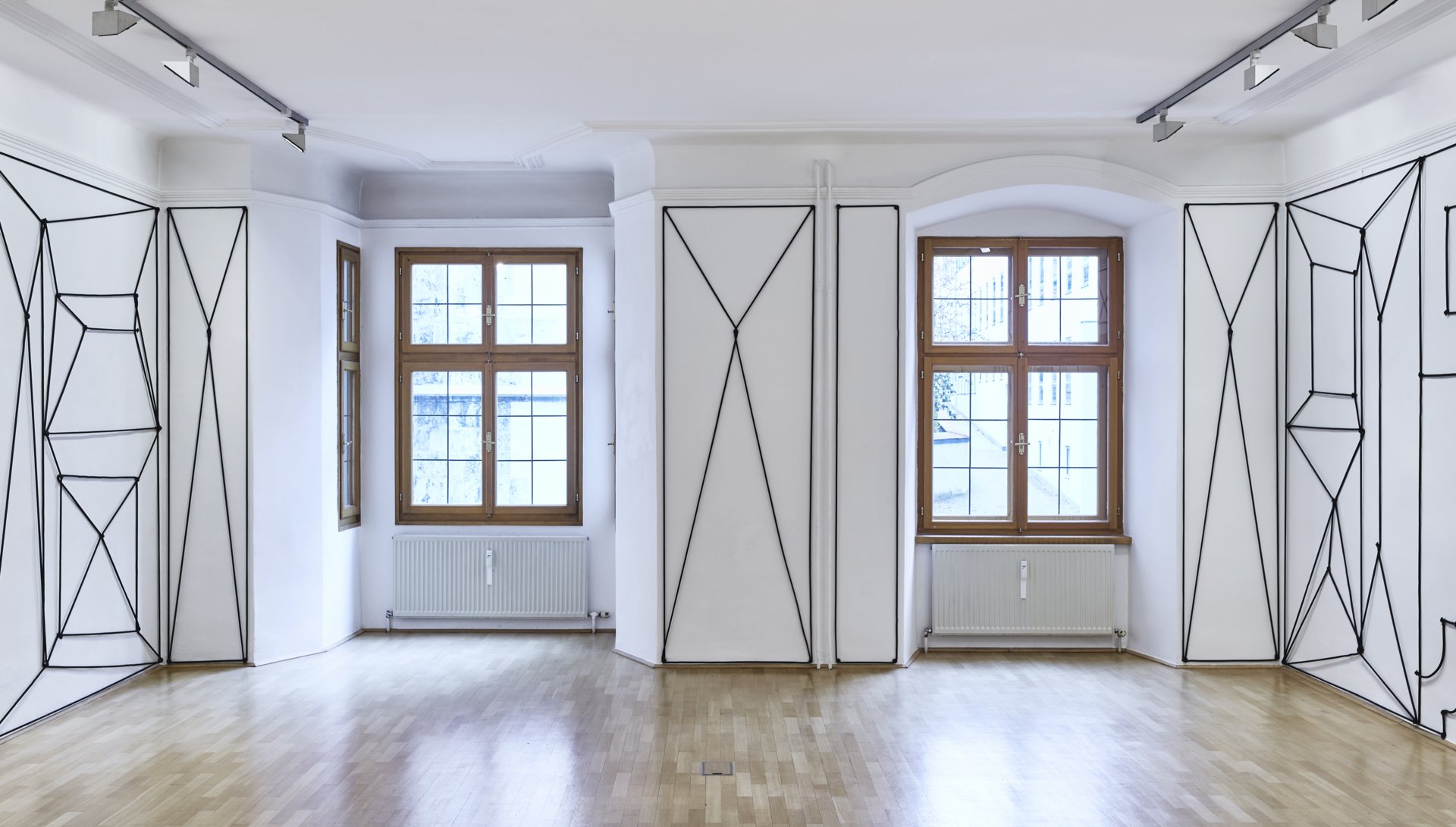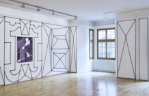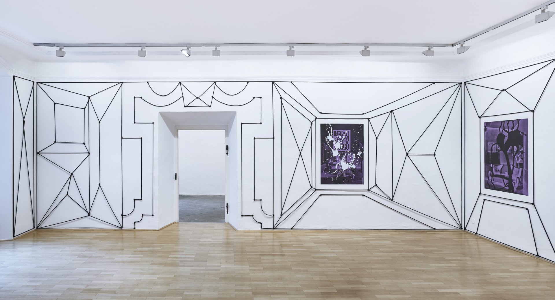 Eine Linie drückt Bewegung aus. Sie verbindet zwei Punkte und sie teilt Felder beziehungsweise Terrains ab. Sie markiert eine Bühne, eine Projektionsfläche und trennt zwischen Szene und Publikum, Real- und Illusionsraum. Julian Göthe hält diese Grenze zwischen Realität und Fiktion jedoch durchlässig. Seine Arbeiten, Zeichnungen, wie Skulpturen und Installationen schalten zwischen den Medien und zwischen Zwei- und Dreidimensionalität hin und her. Der Berliner Künstler und Professor für Bildhauerei in Wien ist bekannt für seine Wandverspannungen. Auch in der aktuellen Ausstellung in Schwaz zieht Julian Göthe mit Polyesterseilen einen alternativen Raum ein. Seine Seilzeichnungen strukturieren die weiße Wandfläche, anders jedoch als das gleichgültige Grid der Moderne. Sie lenken vielmehr den Blick auf Stellen von besonderer Anziehungskraft, ausgewiesene Flächen, Öffnungen und angedeutet opulente Rahmen, die den Kontext für eine Reihe von Postern schaffen, für andere Räume, in die sich die Betrachter_innen als Teil der gesamten Inszenierung hinein imaginieren können. Distanzierungsmomente sind die digitalisierten Drippings, die die Interieurs auf den Postern als eigene Bereiche ausweisen. Es sind keine privaten Raumvisionen, sondern Innenausstattungen von Designern, wie etwa Jean-Michel Frank, die ihre Entwürfe in ihrem Verhältnis zur Gesellschaft zur Diskussion stellen. Die Seilzeichnungen und Raumansichten lassen gewissermaßen die Wände sprechen, weil sie diese auf ausgedehntere Horizonte hin öffnen, als sie die heteronormative Gesellschaft bereithält. Dieses Freiheitsversprechen belässt Göthe allerdings weitgehend in einer Welt der Projektionen, in einem Begehrenskontext, der nicht wieder durch neue Regularien verfestigt werden soll. „Walls Talk“ heißt der Film, der im Kabinett der Galerie gezeigt wird und komplementär zu der Installation im Hauptraum gelesen werden kann. Es ist eine anderthalbstündige Abfolge von Bildmaterial im Kinoformat aus Göthes Universum: Setdesign, barocke Festarchitekturen, Kunst- und Designgeschichte und Musik. Davor schwingen und tänzeln Linienformationen im Rhythmus der Sounds. Sie formen mit manchmal (un)heimlicher Neugierde Bögen und Kringel, gleiten über Wölbungen, schmiegen sich an Elemente, als ginge es um die Entschlüsselung eines sozialen Codes, nur um sich wieder vom nächsten Objekt zu neuen Formen inspirieren zu lassen. Wie Staffagefiguren oder Conférenciers führen sie ins Bildgeschehen ein. Manchmal bilden sie eine Art Vorhang, der am linken Bildrand beiseite gezogen wird, um eine Szene freizugeben. Spielerisch umschmeicheln sie die aus Büchern und Designmagazinen kopierten Ansichten von Repräsentations- und Bühnenarchitekturen, extravaganten Dekors, Fotografien und Filmen. Häufig sind dies Treppen, Faltenwürfe, Rocaillen, hoch aufgerichtete Monumente und muskulöse Körper von Bodybuildern oder auf manieristischen Kupferstichen, beispielsweise von Hendrik Goltzius, die sanft von der Kamera erfasst, nahezu abgetastet werden. Diese Zooms ins Bild eröffnen uns einen differenzierten Blick auf Details, die im Kanon der Kunst wenig Beachtung fanden. Im Verbund mit der Kamera und damit mit dem Auge des Betrachters/der Betrachterin verfolgen, überschneiden oder blocken die geschmeidigen Linien einzelne Bildelemente, aber sie berühren sie nie. Sie bleiben immer in ihrer eigenen vorgeblendeten Sphäre. Die Welt, die Julian Göthe generös mit uns teilt, wird auf einer ästhetischen Ebene verhandelt, die Ambivalenzen zulässt und gerade deshalb das Potential hat etwas zu verändern ohne dogmatisch zu werden.