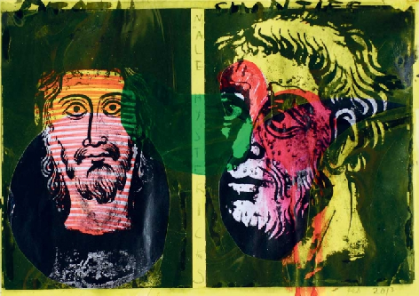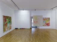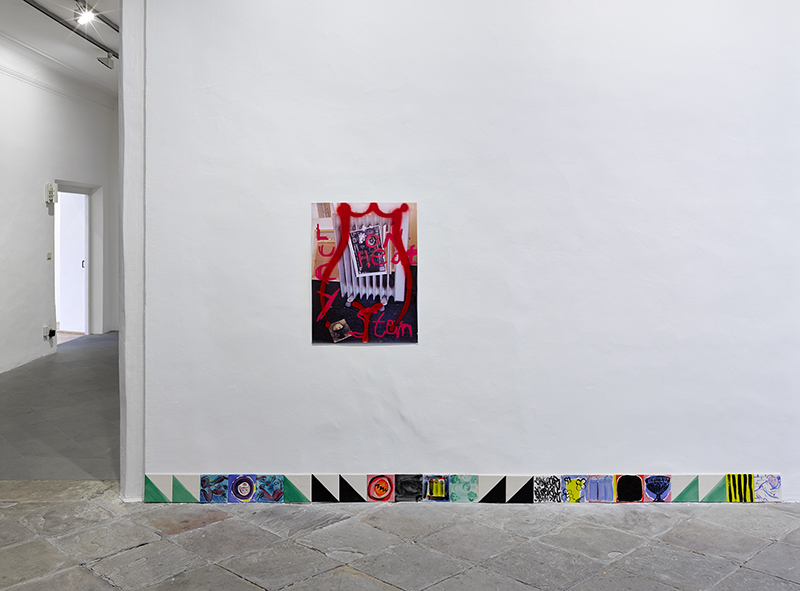 ‚On Heat’ durchzieht als Ganzes ein hitziger Gestus, der Konventionen, die mit Malerei verbunden sind, hinterfragt und destabilisiert. Bei einem Rundgang durch die Ausstellung fällt auf, dass Steins Malereien hier nur selten konventionell als Tafelbild an der Wand hängen, sondern räumlich installativ mit ungewohnten Formen operieren. Beispielsweise als Fries aus bemalten Fliesen, das sich bodennah entlang bestimmter Wände zieht und mit figurativen und abstrakten Motiven bemalt ist oder als ‚Wall Hangings’, die ohne Keilrahmen wie Wandteppiche oder Türverhängungen geradezu interventionistisch an die Wand genagelt sind. Dazu kommen die oben beschriebenen Poster, eine registerartig wandfüllende Hängung von Zeichnungen und ein Baum mit bemalten Ostereiern. Der alte Elektroheizkörper, der inmitten dieser Rauminstallationen steht und zu einem Bildträger umfunktioniert wurde, wirkt hier wie eine humorvolle Persiflage auf heroische Ideen vom künstlerischen Schöpfungsprozess.