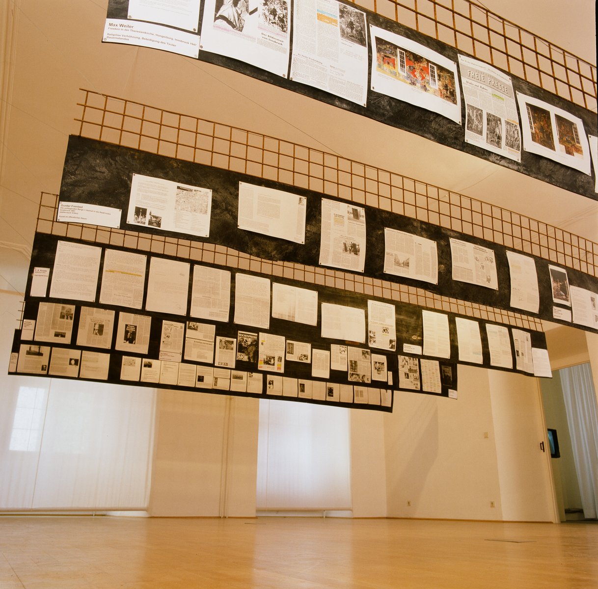Auf alten, von der Decke agbehängten Gummiförderbändern wurden die Fälle dokumentiert: Pressetexte, Dokumente in Kopie, Fotos, Briefe usw. zeichneten den Tathergang und die Konsequenzen nach. Bewusst wurde auf eine chronologische Darstellung verzichtet, um die impulsiven und teilweise unkontrollierten Reaktionen zu verdeutlichen.