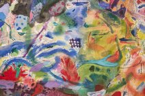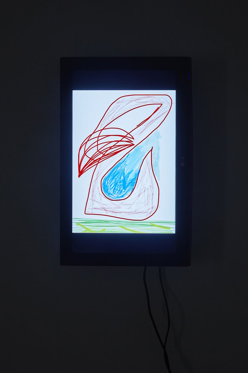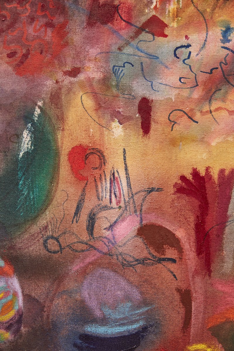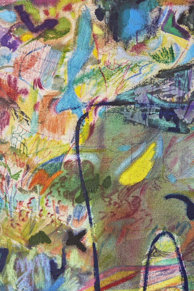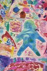 In der Ausstellung von Max Brand in Schwaz gibt es tatsächlich einen kleinen Hund, den er in die rechte obere Ecke eines Bildes gemalt hat. Der Ausstellungstitel „Die Abenteuer des Hündchen Bleibsoklein“ lässt sich dennoch nicht direkt auf seine neuen Arbeiten beziehen. Er ist vielmehr eine sprachliche Äußerung, ein im Kontext der Kunst ungewöhnlicher Klang, der sich zu den über Brands Leinwänden driftenden Gestalten gesellt. Der Titel, also die Benennung der Figur, hat immerhin zur Folge, dass der Hund erhalten geblieben ist, statt umgehend wieder übermalt zu werden, um Platz für neue Konstellationen zu schaffen. Die Zeile scheint nicht notwendig vom Künstler selbst formuliert, sondern in einem anderen Zusammenhang, z. B. dem der Kinderbuchillustration aufgelesen. Damit hat sie etwas mit den Figuren, Tieren, Pflanzen und Spielzeugen, den Flecken und Kritzeln, die die Bilder gleichzeitig bevölkern, gemeinsam. Auch sie könnten von jemand anderem gemalt bzw. gezeichnet worden sein, vielleicht auf Schulbänke oder Höhlenwände, und der Künstler verarbeitet nur die Überreste anonymer Produktionen.