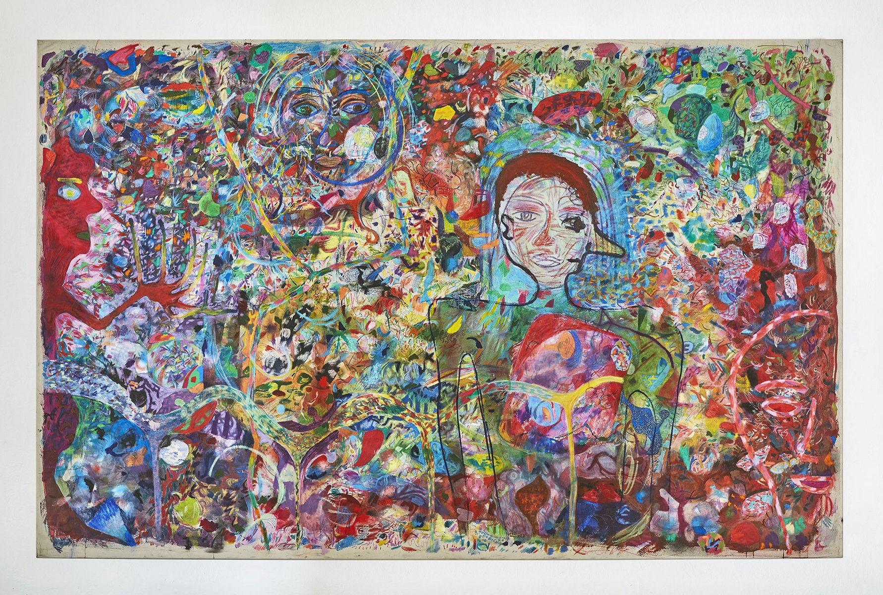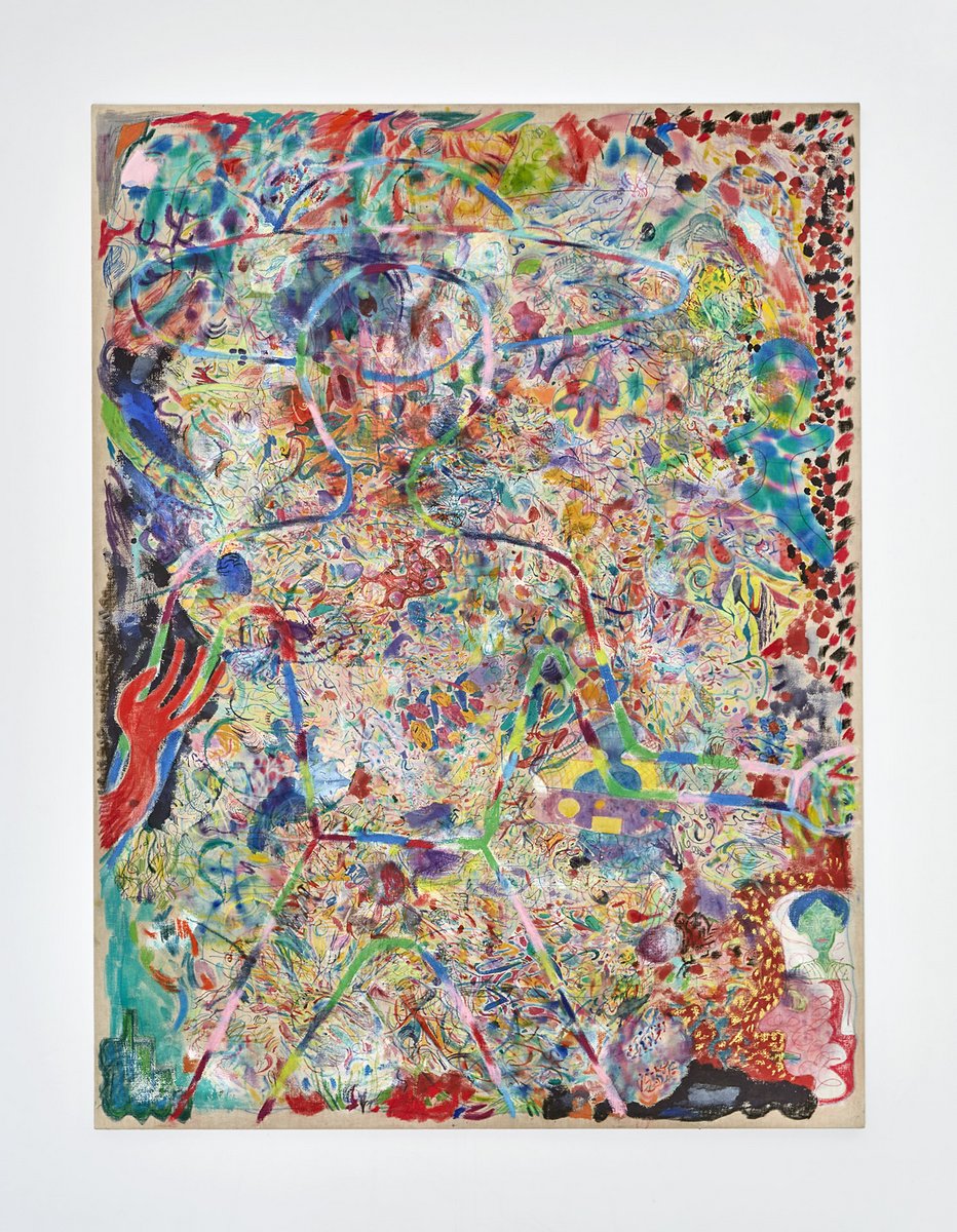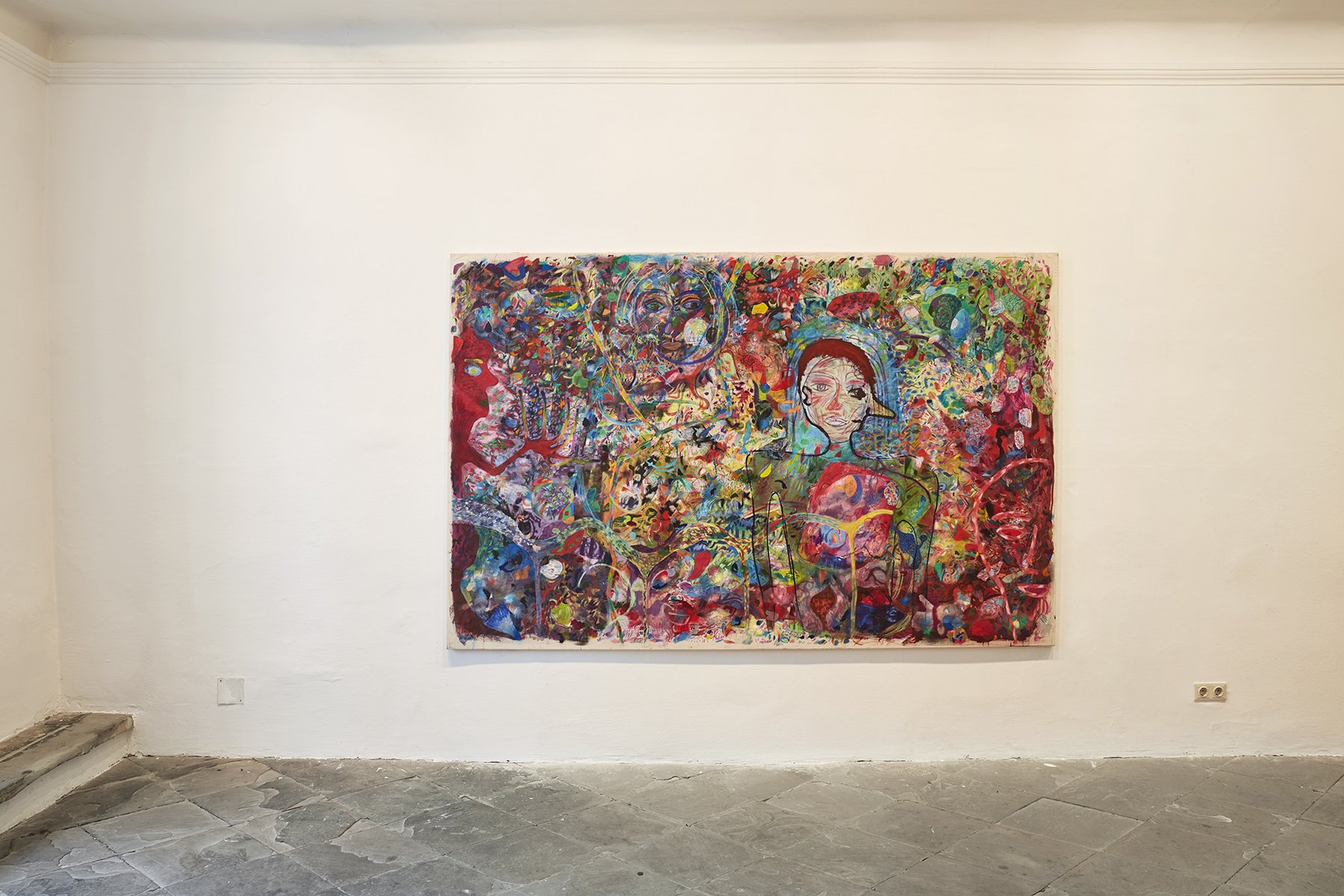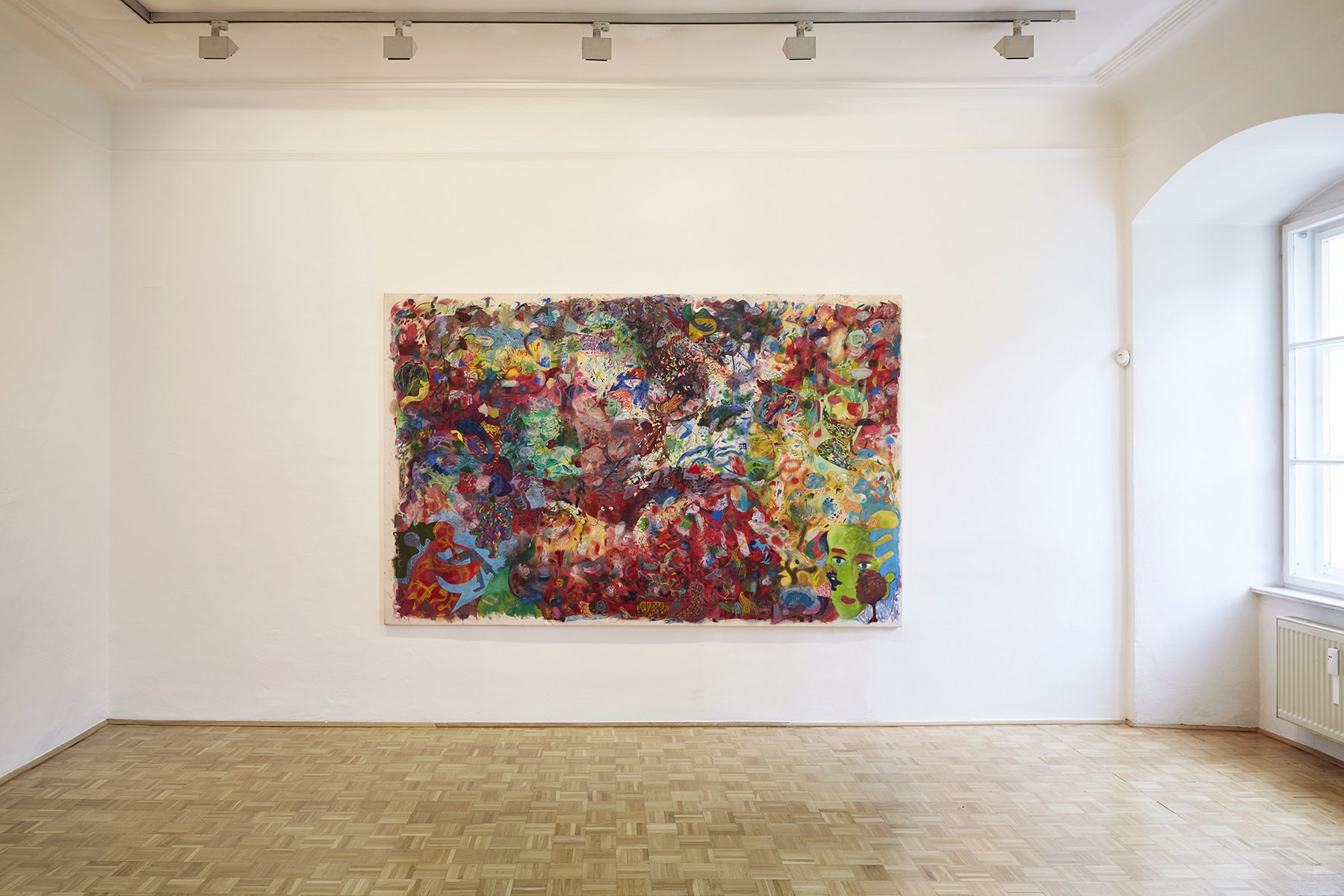 Obwohl seine Bilder einen hohen Wiedererkennungswert haben, geht es weniger um die individuelle Handschrift oder um die Kontrolle derselben. Vielmehr überlässt sich Max Brand dem Fluss der Bildzeichen, die er nicht hierarchisch strukturiert. Das bedeutet im Umkehrschluss aber nicht, dass sein Arbeitsprozess ungesteuert verläuft. Es sind bewusste Entscheidungen in Bezug auf Komposition, Farbe und Linienführung zugunsten bestimmter Formen, die auf der Oberfläche dieser Art Ursuppe malerischer Artikulation stehen bleiben dürfen und die Dynamik des Bildes antreiben oder beruhigen. Manche Figuren können ohne einander nicht sein, andere sind so luftig umschrieben, dass sie von den Welten, die sich in ihren Binnenformen tummeln, scheinbar unberührt bleiben. Einige schauen die Betrachter*innen direkt an und verweisen sie in dem Moment der Begegnung wieder auf ihre Position außerhalb des Bildraums.