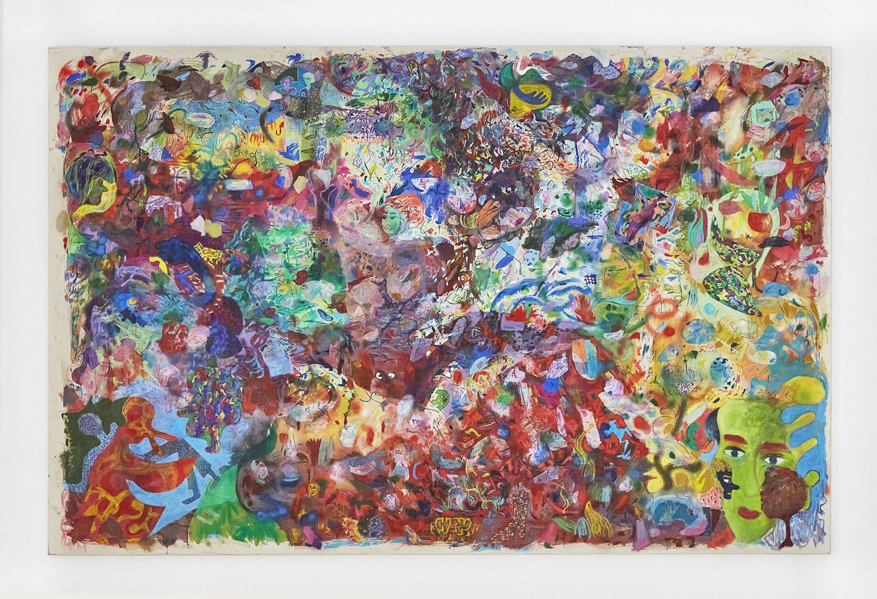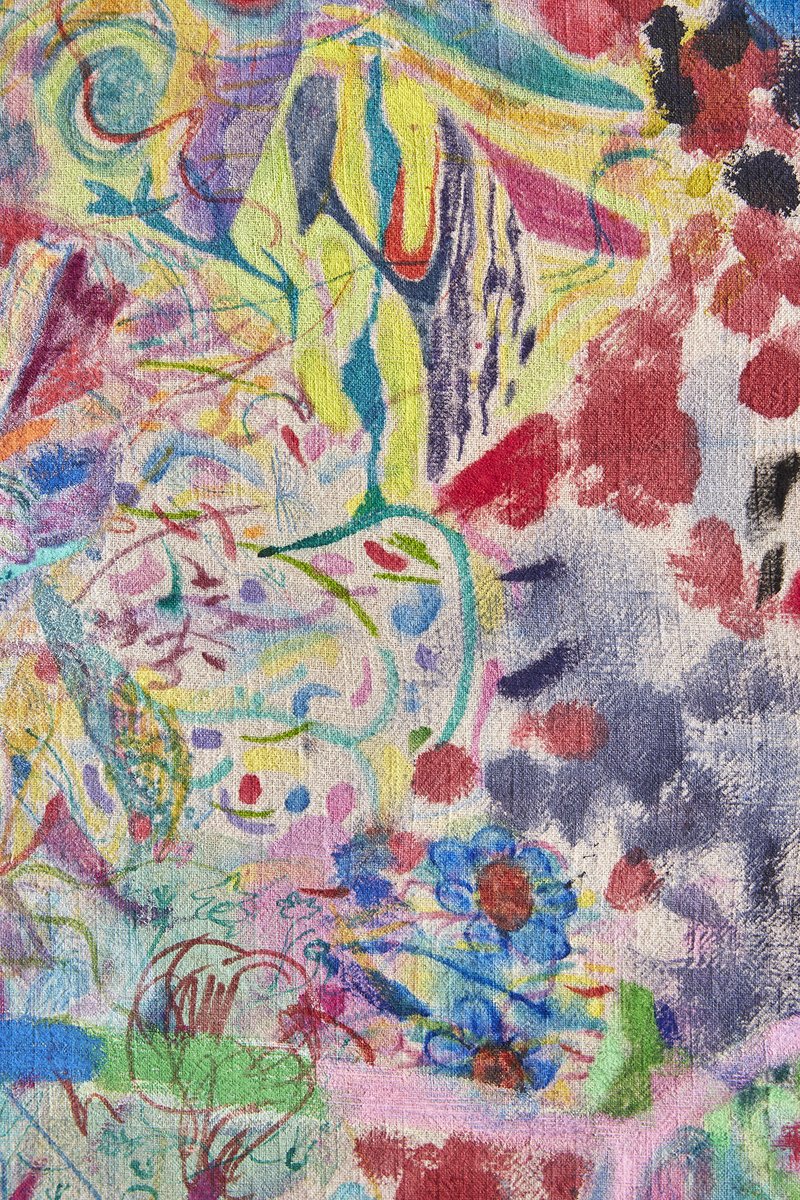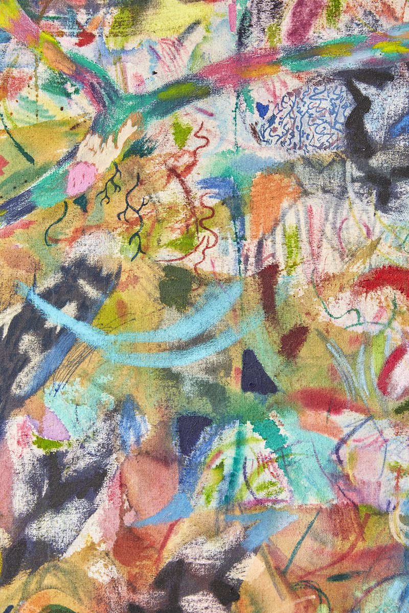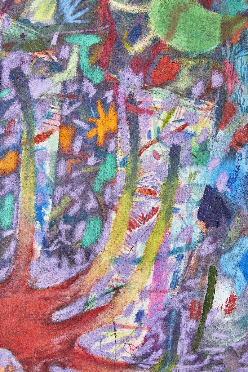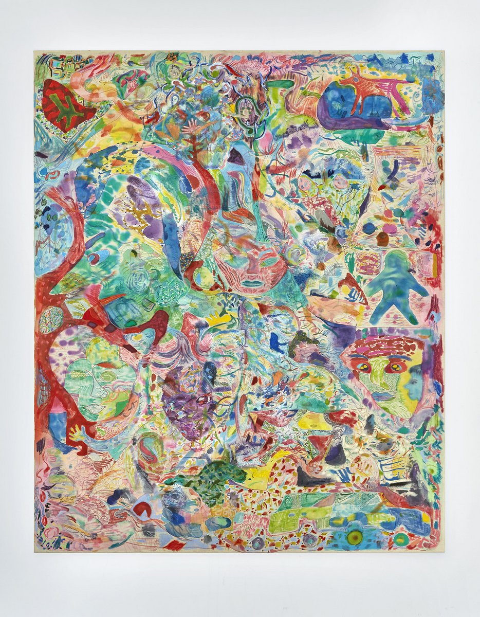 Obwohl seine Bilder einen hohen Wiedererkennungswert haben, geht es weniger um die individuelle Handschrift oder um die Kontrolle derselben. Vielmehr überlässt sich Max Brand dem Fluss der Bildzeichen, die er nicht hierarchisch strukturiert. Das bedeutet im Umkehrschluss aber nicht, dass sein Arbeitsprozess ungesteuert verläuft. Es sind bewusste Entscheidungen in Bezug auf Komposition, Farbe und Linienführung zugunsten bestimmter Formen, die auf der Oberfläche dieser Art Ursuppe malerischer Artikulation stehen bleiben dürfen und die Dynamik des Bildes antreiben oder beruhigen. Manche Figuren können ohne einander nicht sein, andere sind so luftig umschrieben, dass sie von den Welten, die sich in ihren Binnenformen tummeln, scheinbar unberührt bleiben. Einige schauen die Betrachter*innen direkt an und verweisen sie in dem Moment der Begegnung wieder auf ihre Position außerhalb des Bildraums.