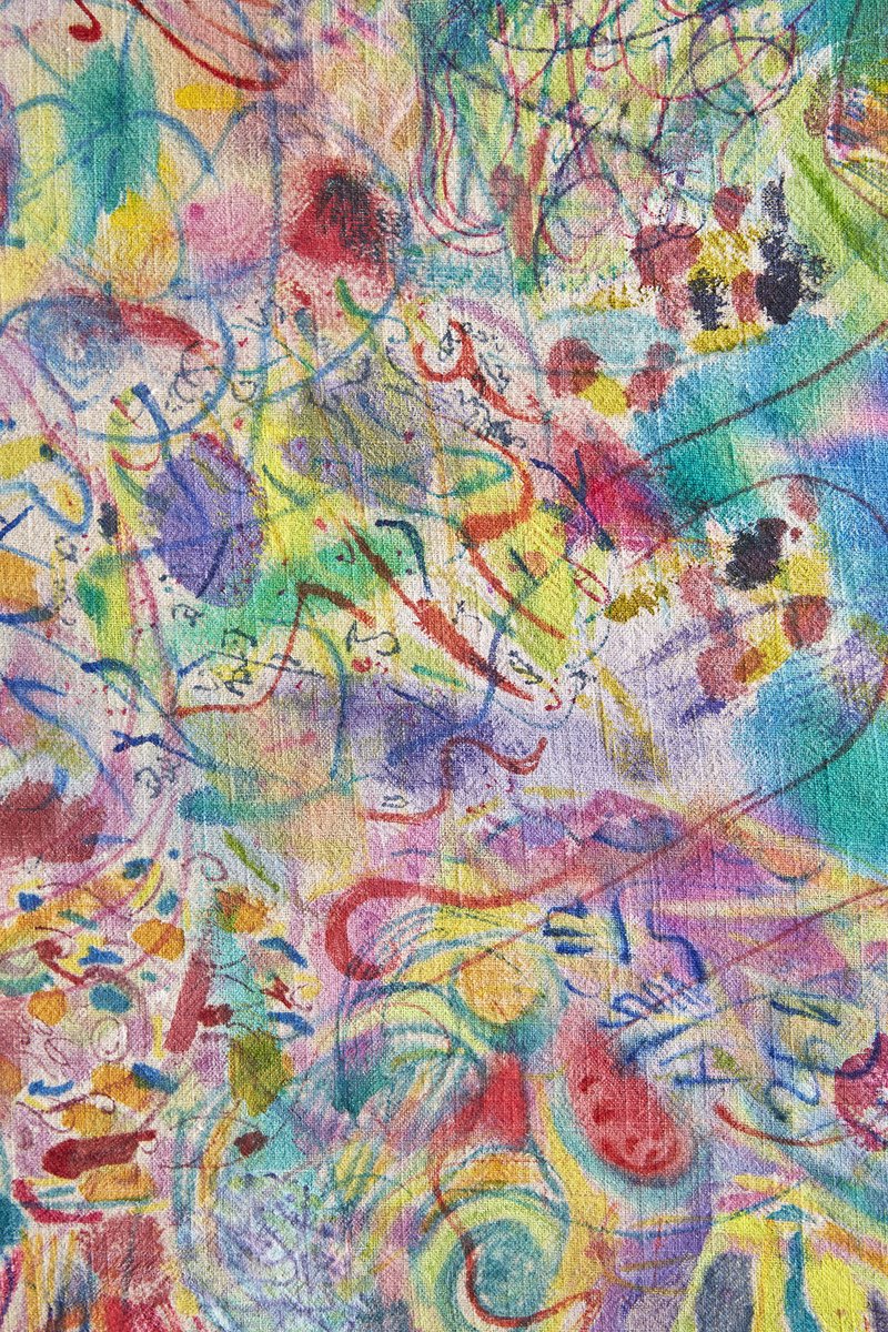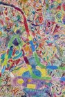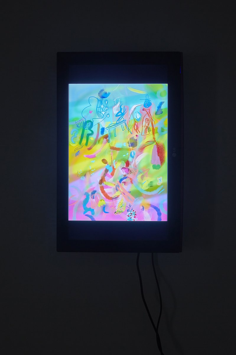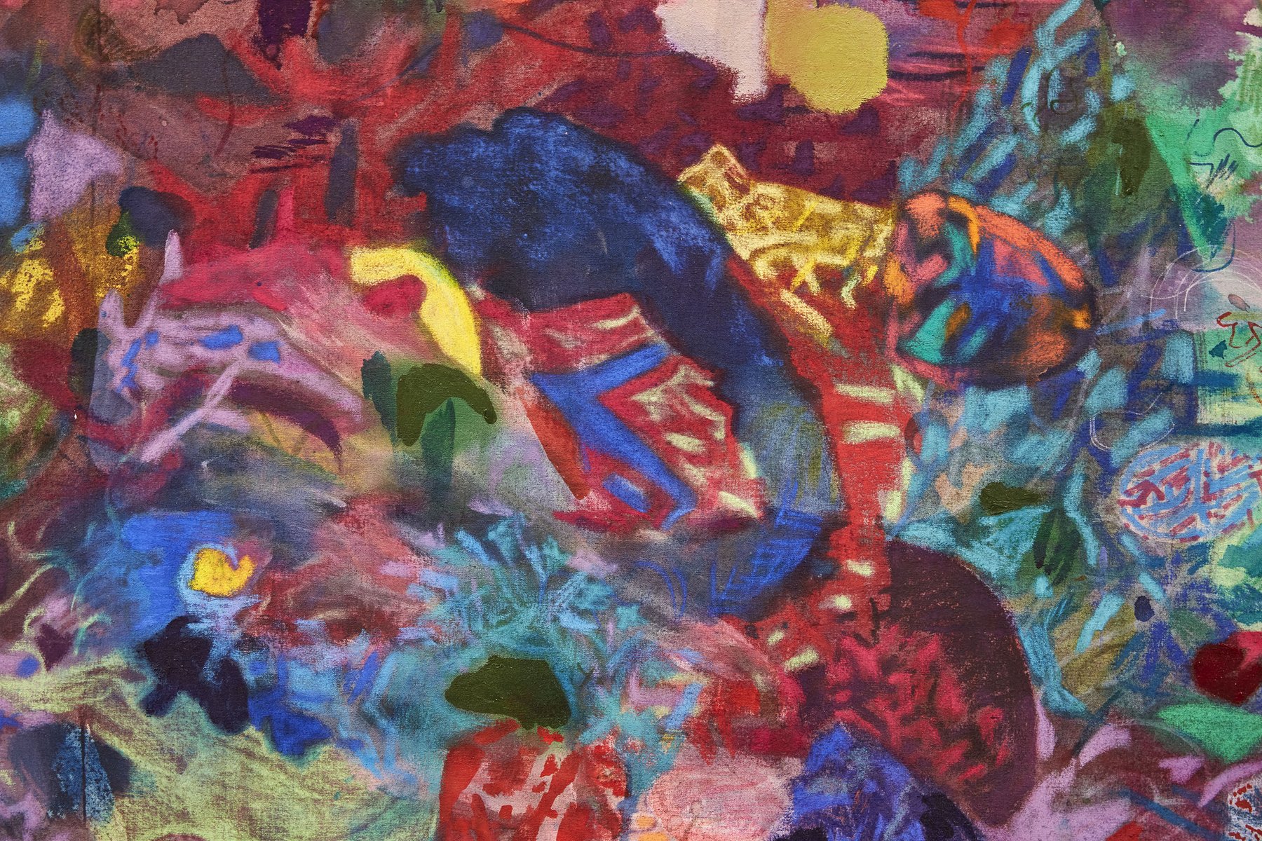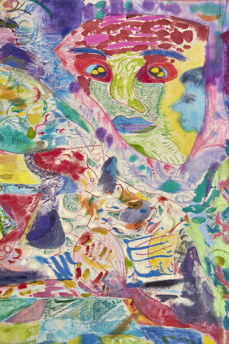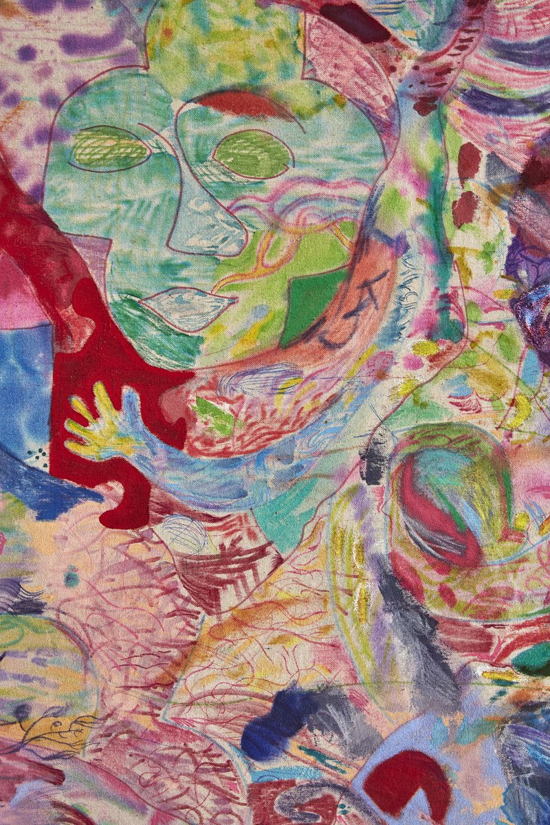 Obwohl seine Bilder einen hohen Wiedererkennungswert haben, geht es weniger um die individuelle Handschrift oder um die Kontrolle derselben. Vielmehr überlässt sich Max Brand dem Fluss der Bildzeichen, die er nicht hierarchisch strukturiert. Das bedeutet im Umkehrschluss aber nicht, dass sein Arbeitsprozess ungesteuert verläuft. Es sind bewusste Entscheidungen in Bezug auf Komposition, Farbe und Linienführung zugunsten bestimmter Formen, die auf der Oberfläche dieser Art Ursuppe malerischer Artikulation stehen bleiben dürfen und die Dynamik des Bildes antreiben oder beruhigen. Manche Figuren können ohne einander nicht sein, andere sind so luftig umschrieben, dass sie von den Welten, die sich in ihren Binnenformen tummeln, scheinbar unberührt bleiben. Einige schauen die Betrachter*innen direkt an und verweisen sie in dem Moment der Begegnung wieder auf ihre Position außerhalb des Bildraums.