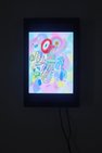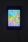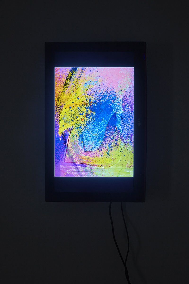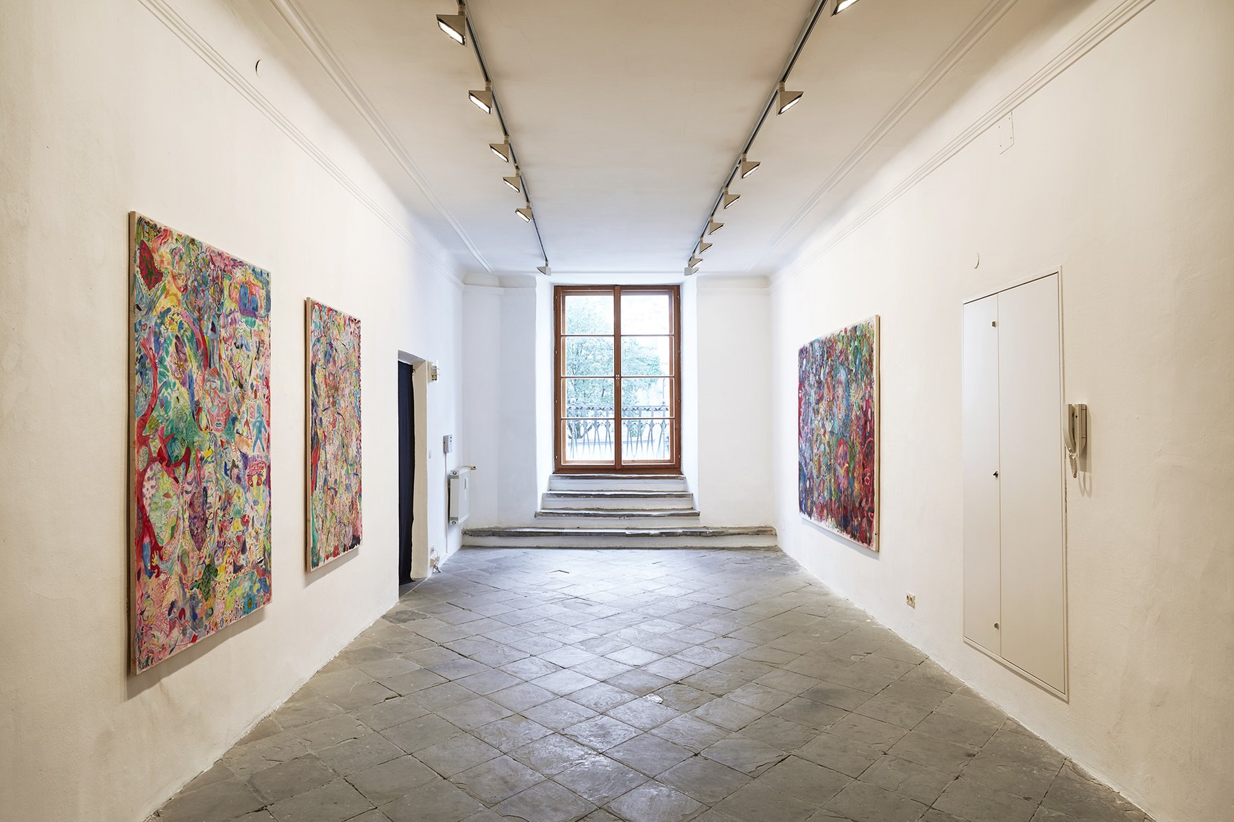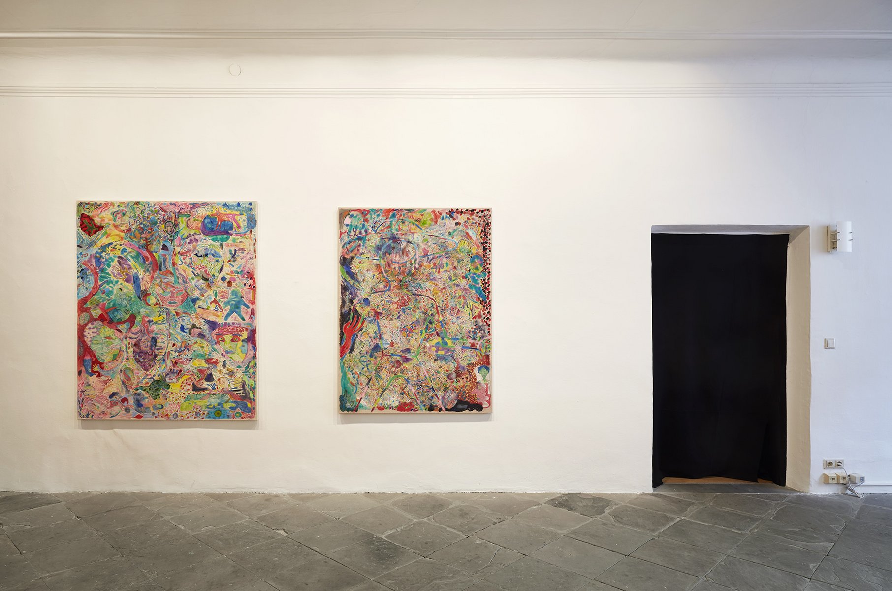 Übergänge von Bild zum realen Raum spielen in vielen von Brands Präsentationen, in denen sich die Malerei über den Bildrand auf Böden und Wänden ausdehnt, eine Rolle. In Schwaz übernimmt die Performance größtenteils den expansiven Part. „Light Therapy“ von Michele di Menna mit Max Brand und den Lonely Boys (Daphne Ahlers und Rosa Rendl) findet zur Eröffnung im Hauptraum der Galerie statt, während sich Brands Bilder im Flur, Foyer und Büro verteilen. Michele di Menna ist in Schwaz keine Unbekannte. 2017 hat sie in der Galerie für „In the Land of Skeletons“ performative Handlung und Ausstellung zusammengeführt.