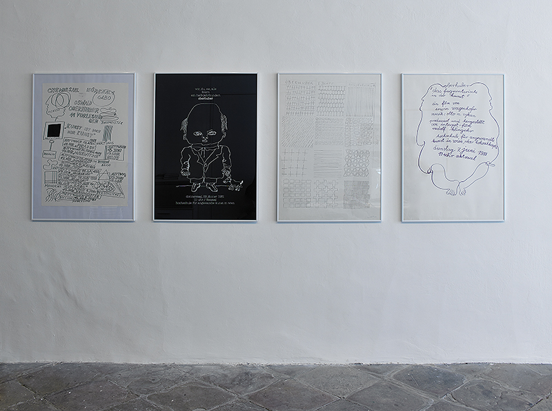 In der Galerie der Stadt Schwaz zeigt Oswald Oberhuber eine Reihe von Plakaten, die er alle selbst gestaltet hat, 26 Kartonskulpturen, sowie Collagen, Briefe, und Dokumentationen von Installationen und Environments, die zum Teil das erste Mal gezeigt werden. Allen Medien, die Oberhuber einsetzt gemeinsam ist, dass sie informierend im doppelten Sinn des Wortes wirken.