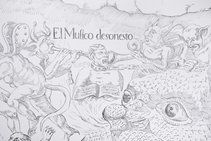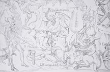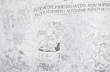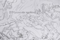 Wird der Raum von der Nordseite her betreten, wird eine Gesamtansicht auf die Silberstiftzeichnung ermöglicht. Es ist eine exakte Wiedergabe des 1739 entstandenen Bildes Infierno vom Meister von Caquiaviri. St. Antonius ist eine Kirche in Caquiaviri, in der Region La Paz in Bolivien. Sie wurde um 1560 von den ersten Franziskaner-Missionaren errichtet. Das Originalbild ist Bestandteil einer der wenigen vollständig erhaltenen beeindruckenden Bilderensembles der so genannten Postrimerías, welche die ganze Kirche in Caquiaviri ausfüllen. Postrimerías (Darstellungen von Tod, Jüngstem Gericht, Höllenqual) waren in der Gegend um den Titicacasee sehr verbreitet. Sie gehören zu den ersten christlichen Bildmotiven in Südamerika.