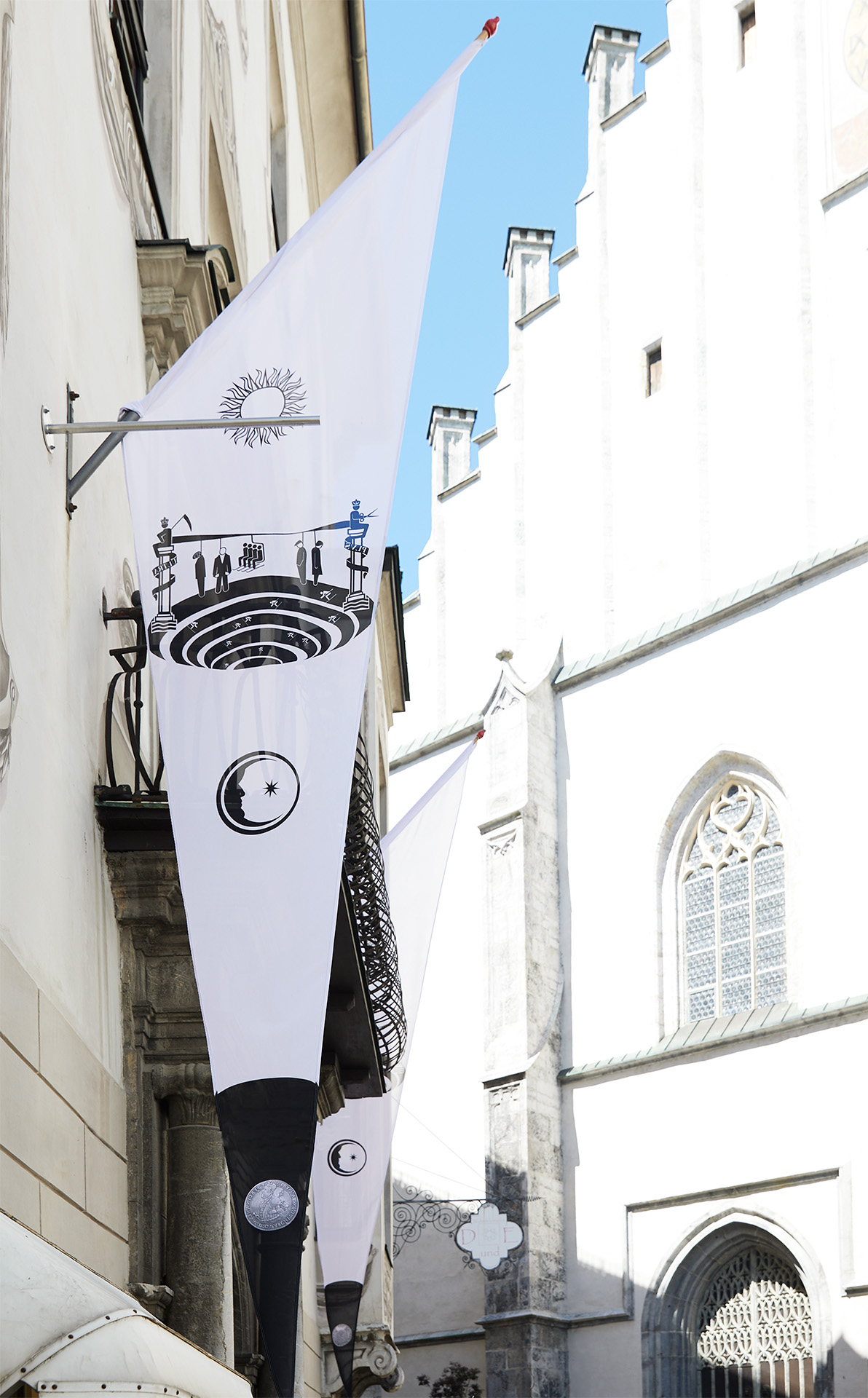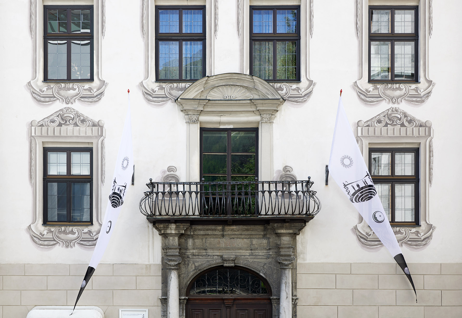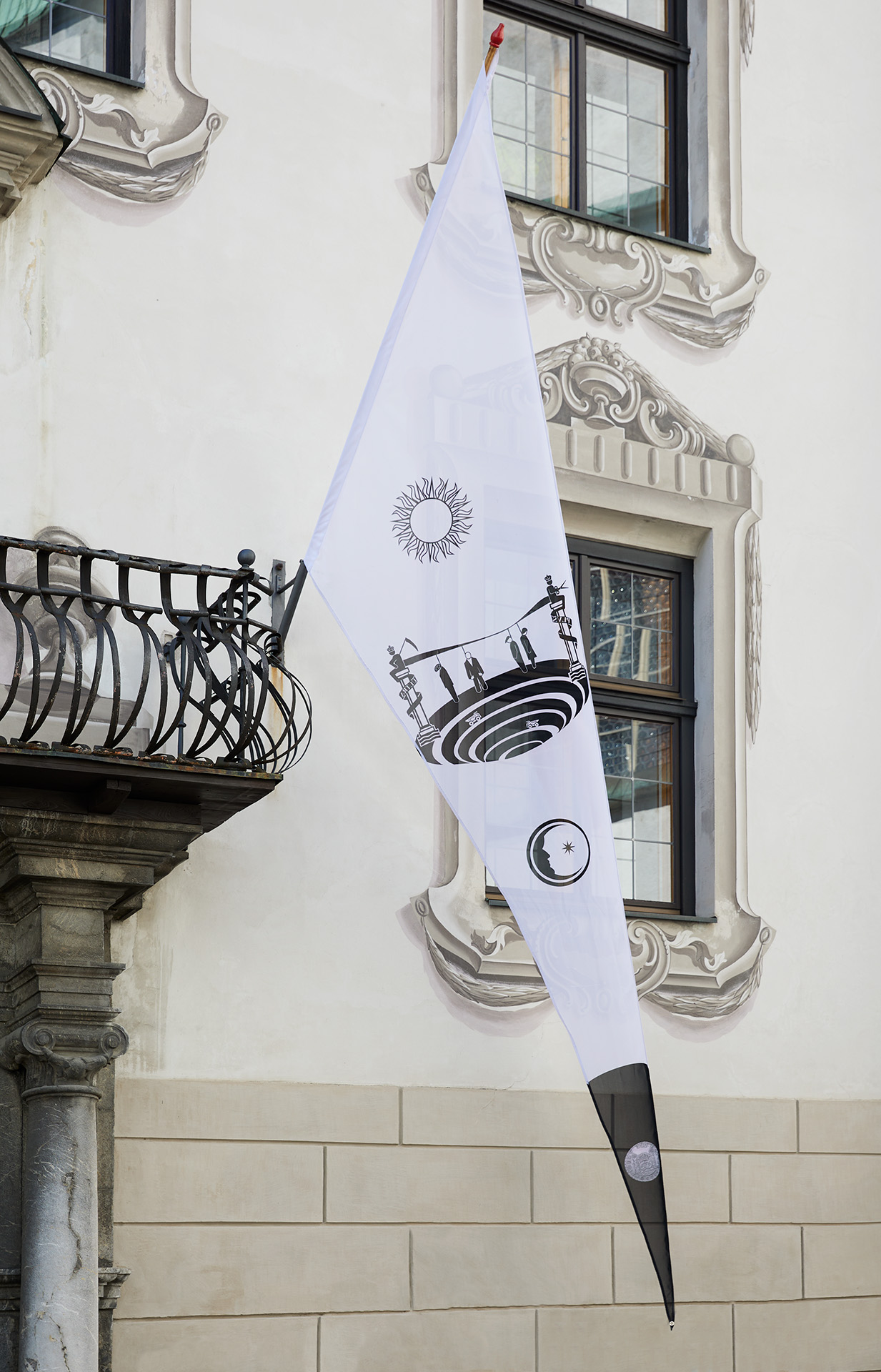 Der Balkon des Palais Enzenberg ist flankiert von zwei Fahnen. Darauf abgebildet ist zum einen die Münze Potosí, darüber die beiden Säulen des Herakles, entnommen aus dem spanischen Wappen mit dem Schriftband plus ultra (immer weiter), als Zeichen des Aufbaus eines spanischen Weltreichs durch die spanische Kolonisation Amerikas im Laufe des 16. Jahrhunderts. In der Mitte kreisen in einer hinabsteigenden Spirale die Bagger Richtung Erdinnerem. Auf der anderen Seite befindet sich parallel dazu die Fahne mit der Münze Hall. Darauf abgebildet ist Erzherzog Ferdinand II. Im 16. Jahrhundert revolutionierte Hall das Münzprägewesen mit einer besonderen Walzenprägemaschine. Das Wissen über diese Münzprägetechnik wurde über den spanischen Hof, unter König Philipp II. (Cousin von Erzherzog Ferdinand II), bis in die spanischen Kolonien transferiert. Während sich im Haller Münzmuseum nur mehr eine aufwendige Rekonstruktion befindet, sind in Potosí noch Originale von Prägemaschinen nach Haller Vorbild im Museum Casa de la Moneda erhalten. Auch diese Fahne ist von den Säulen und Bändern flankiert. In der Mitte ist ein Vierer-Sessellift zu sehen. In dieser Spirale sind es anstelle der Bagger Skifahrer*innen, die in kreisenden Linien nach unten fahren.