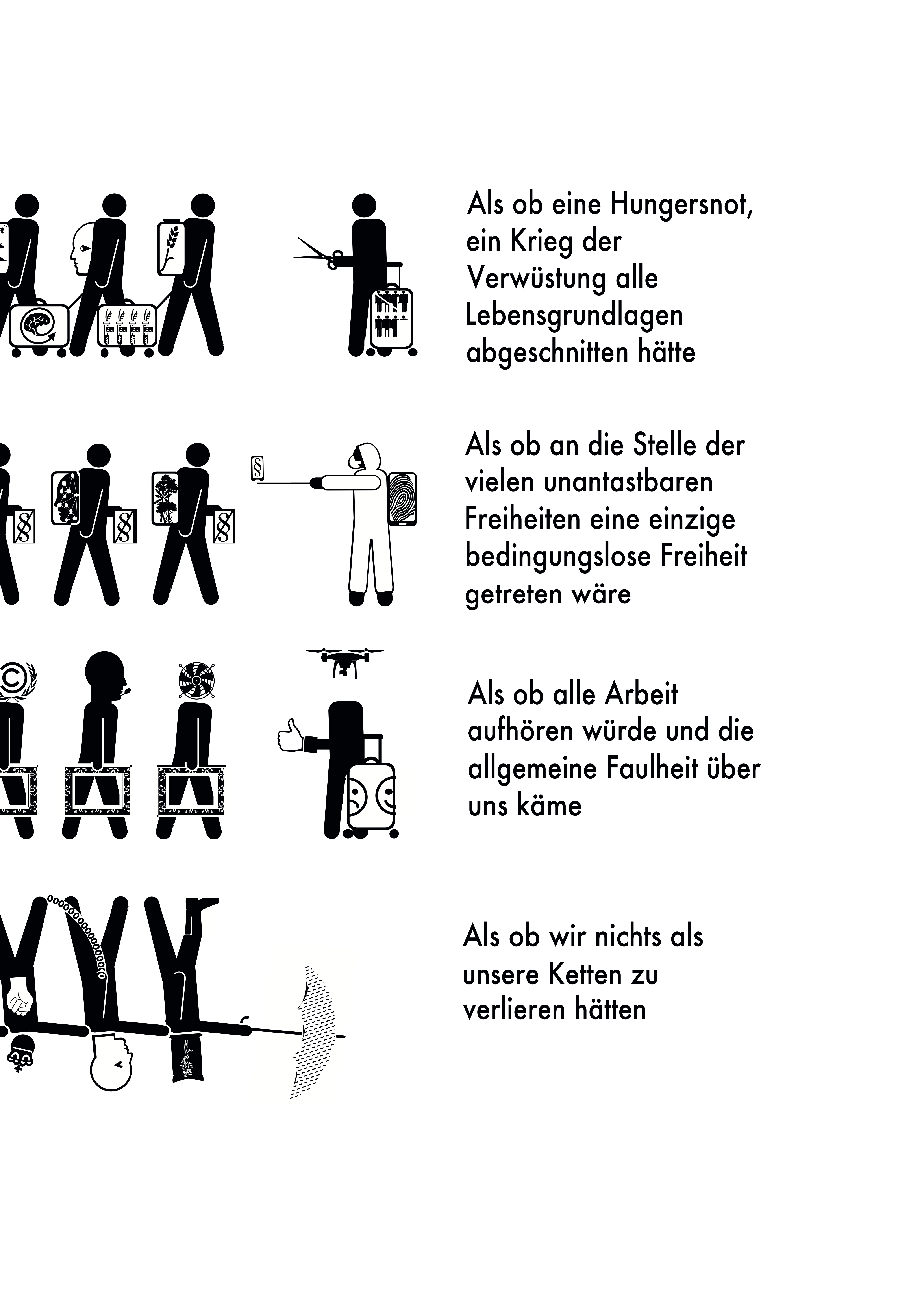 Die Grafiken, welche auf der Einladungskarte und dem Plakat abgebildet sind, finden sich auch in der Ausstellung wieder. Sie thematisieren die Fragestellungen des Archivs und beschäftigen sich mit den Problemen unserer Zeit. Dinge wie Bildproduktion, Credits, die Selbstdarstellung, Machtstrukturen, Registrierungen, persönliche Daten, Generationsungerechtigkeit uvm. werden in Piktogrammen thematisiert.