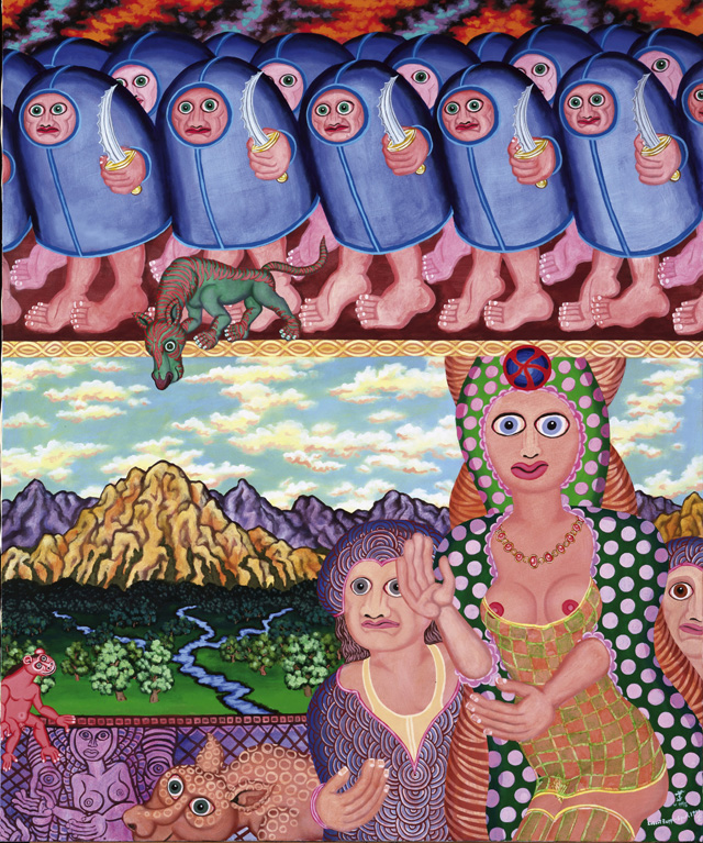 Die figurativen Bilder von Robert Zeppel-Sperl (1944 – 2005) leben von üppigen Ornamenten, Mustern und Farben, die zum Bildteppich seiner Figurengruppen und Fabelwesen werden. Er entführt den Betrachter in die verwunschenen Welten der Amazonen und Götter mit ihren verzauberten Pflanzen und Tieren, die stark von der Kultur Balis geprägt sind, wo er bis zuletzt lebte und arbeitete. Seine oft großformatigen Arbeiten verdichten sich zu komplexen Bild in Bild-Kompositionen, die mit ihren formenreich dargestellten Landschaften, Menschen- und Tiergruppen dem Sprachklang weit zurückliegender Überlieferungen alter Geschichtenerzählern nachzuspüren scheinen.