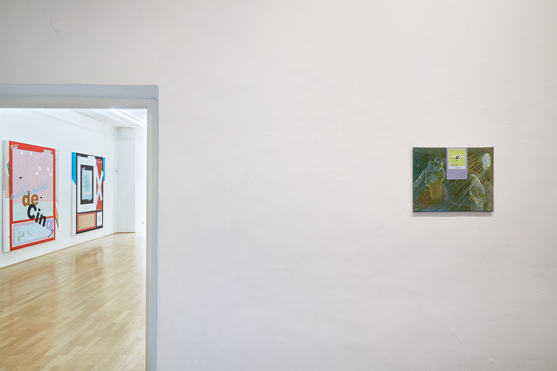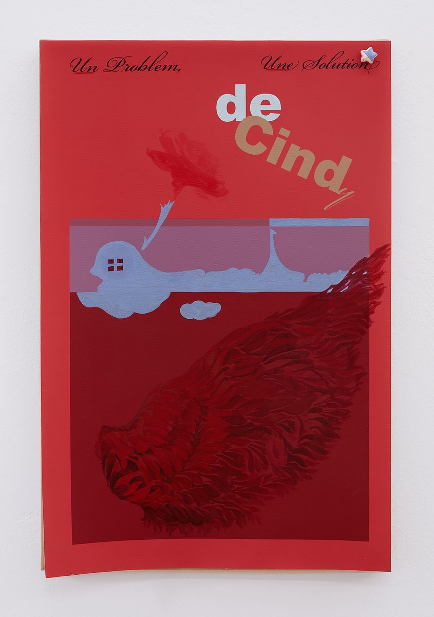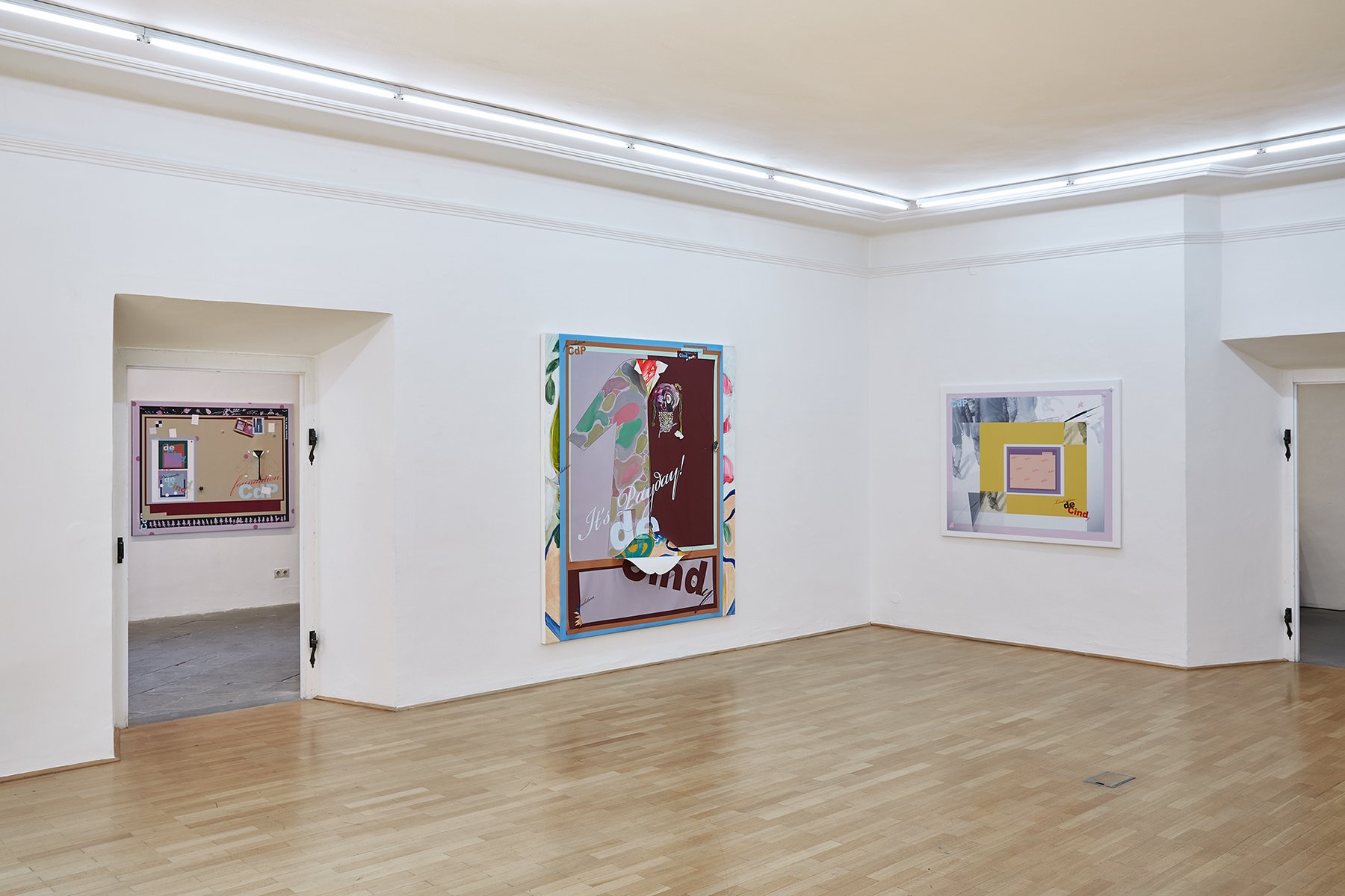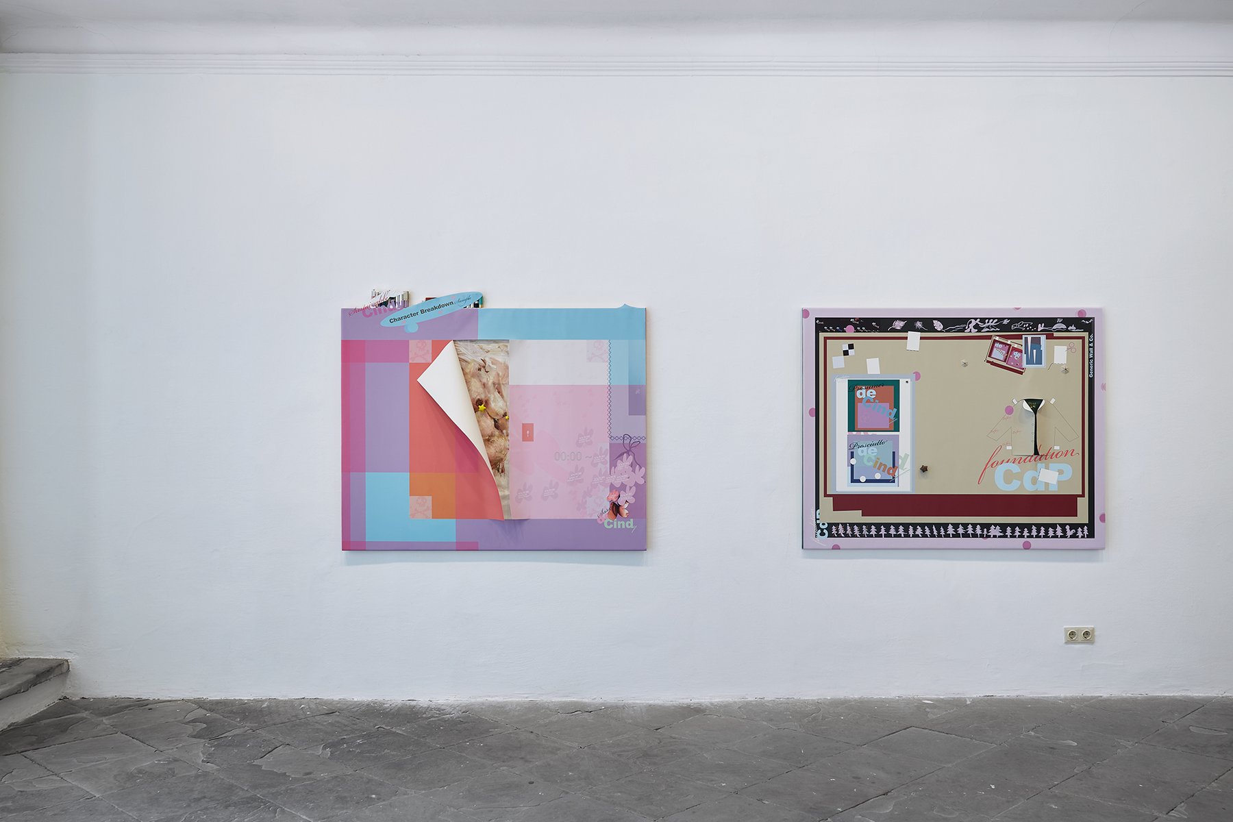 Probleme und ihre Lösungen, character breakdown und andere Mechanismen und Unwegbarkeiten des Storytelling, nicht zuletzt die, das hier buchstäblich etwas dahinter steckt, das auf einen Plot, auf eine mögliche Enthüllung hindeutet: In Seyoung Yoons neuesten Arbeiten sind bedruckte Leinwände auf Malereien platziert. Sie verbergen den gemalten Hintergrund und zugleich treten die verschiedenen Ebenen miteinander durch diverse Öffnungen und Bearbeitungen in Beziehung. Manuelle Eingriffe wie Schnitte, darauf gemalte Elemente und kleine Objekte unterbrechen die grafische Oberfläche, die Corporate Identity, und verkomplizieren so die Materialisierung einer Idee (die sich verkaufen lässt, die einen corporate Nutzen hat unter der corporate Oberfläche.