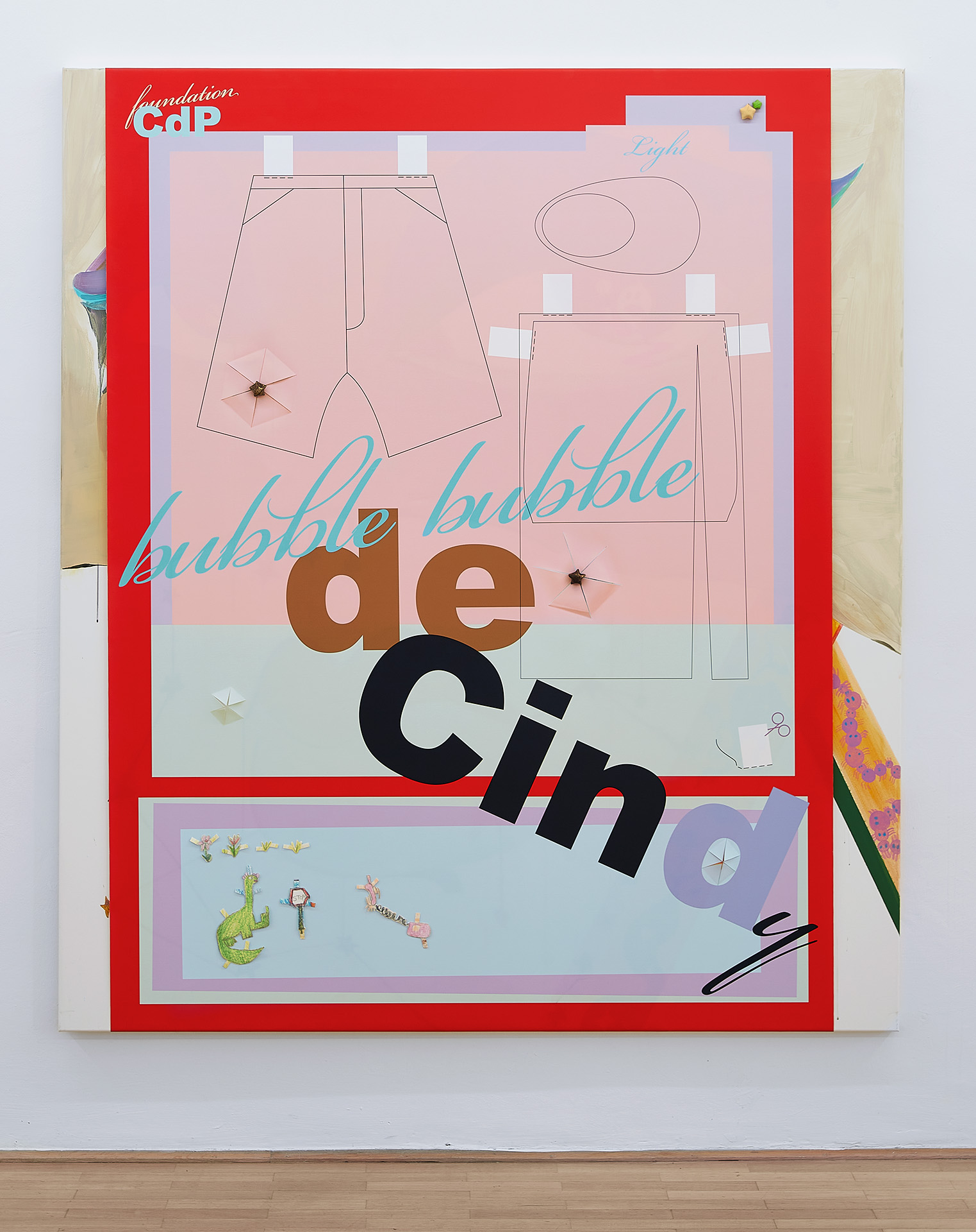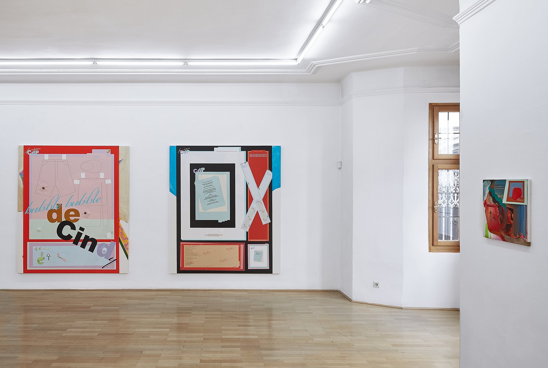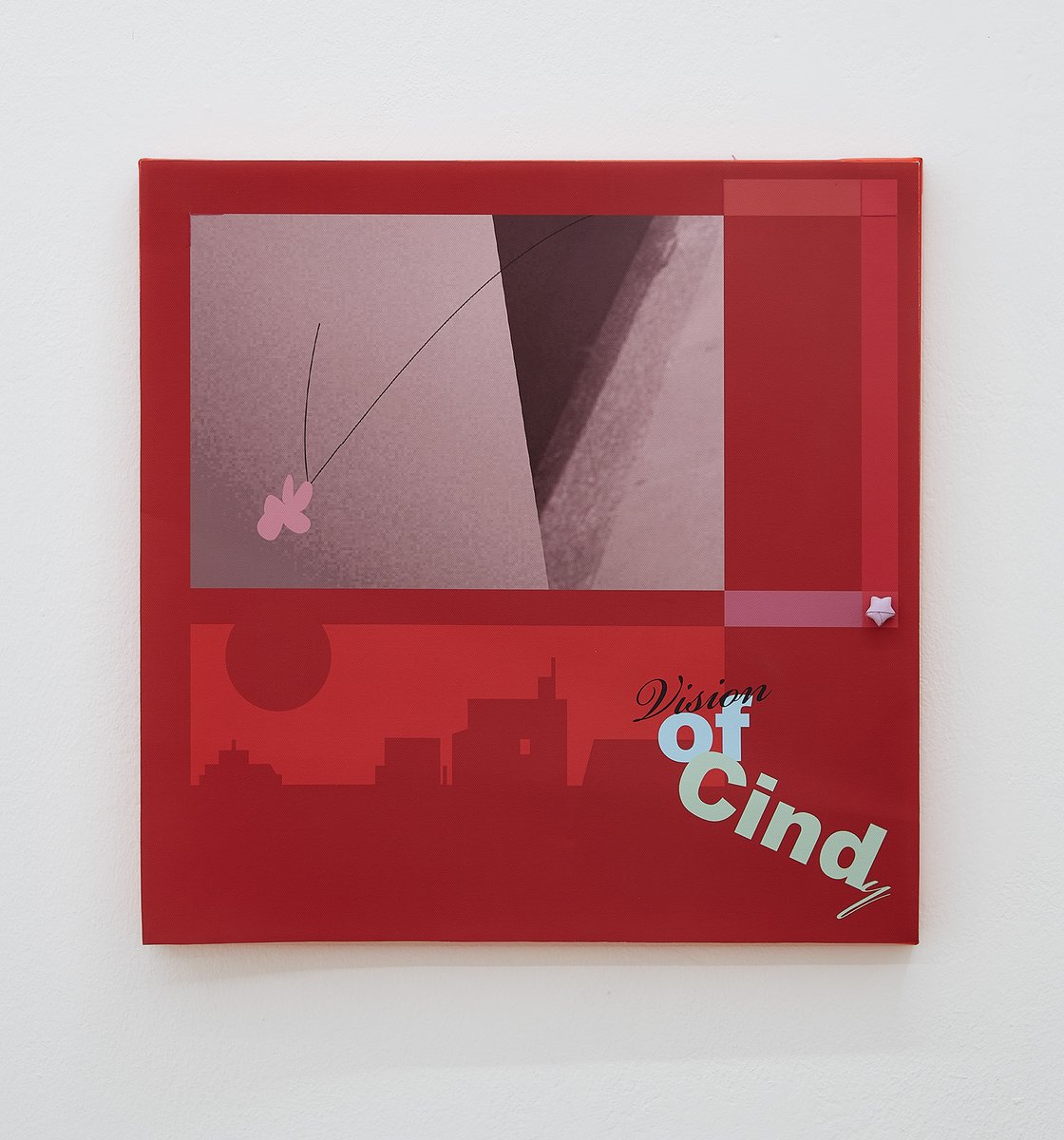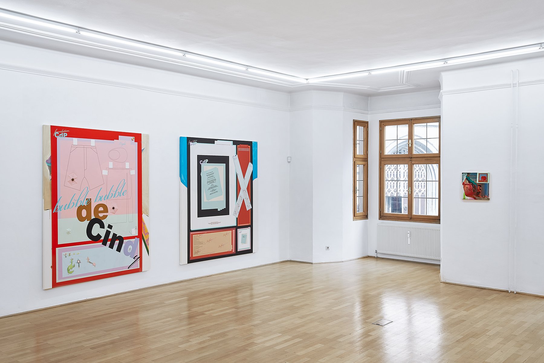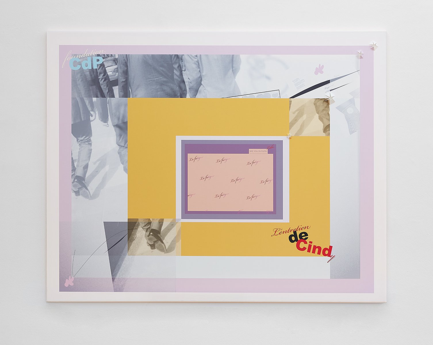 Probleme und ihre Lösungen, character breakdown und andere Mechanismen und Unwegbarkeiten des Storytelling, nicht zuletzt die, das hier buchstäblich etwas dahinter steckt, das auf einen Plot, auf eine mögliche Enthüllung hindeutet: In Seyoung Yoons neuesten Arbeiten sind bedruckte Leinwände auf Malereien platziert. Sie verbergen den gemalten Hintergrund und zugleich treten die verschiedenen Ebenen miteinander durch diverse Öffnungen und Bearbeitungen in Beziehung. Manuelle Eingriffe wie Schnitte, darauf gemalte Elemente und kleine Objekte unterbrechen die grafische Oberfläche, die Corporate Identity, und verkomplizieren so die Materialisierung einer Idee (die sich verkaufen lässt, die einen corporate Nutzen hat unter der corporate Oberfläche.