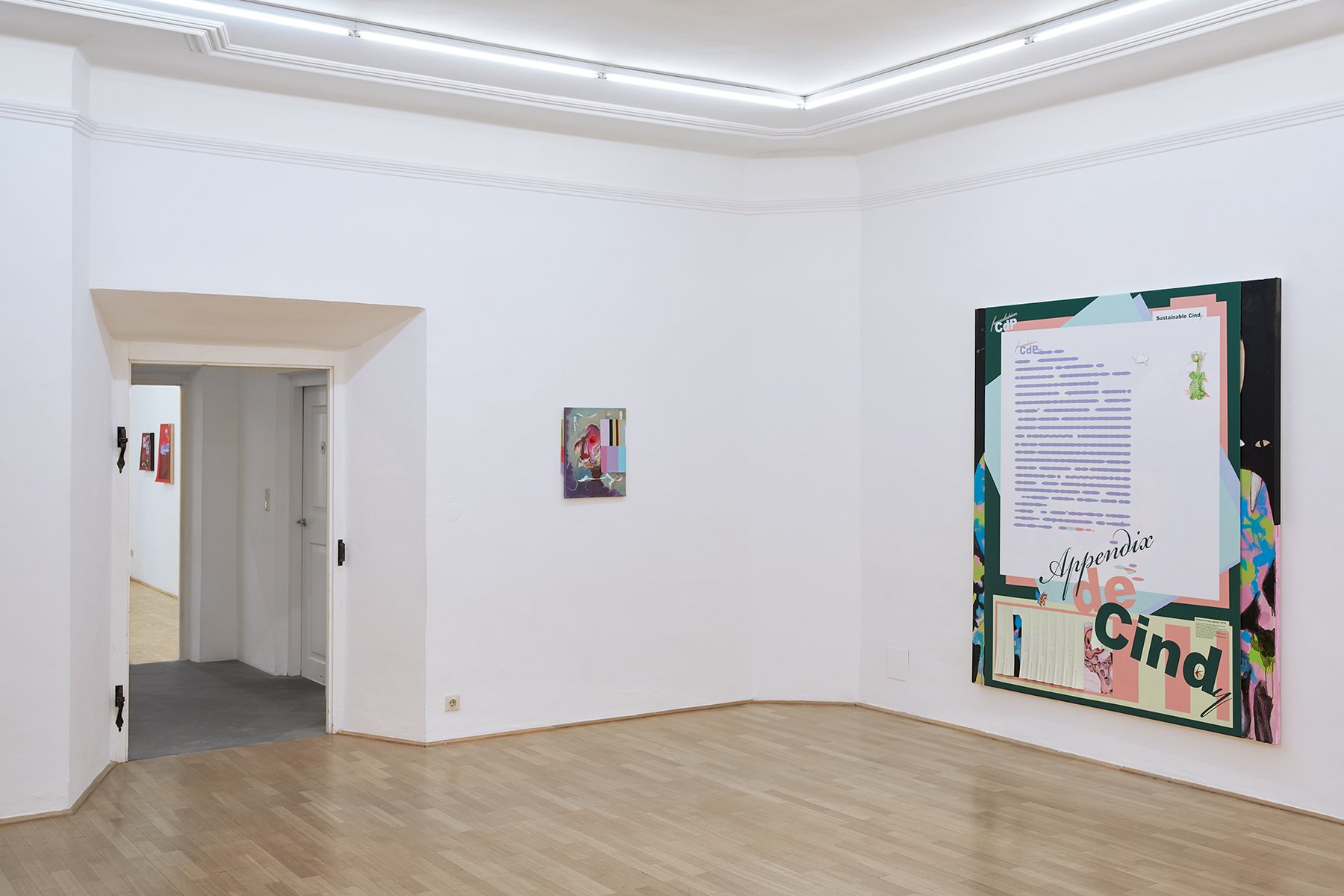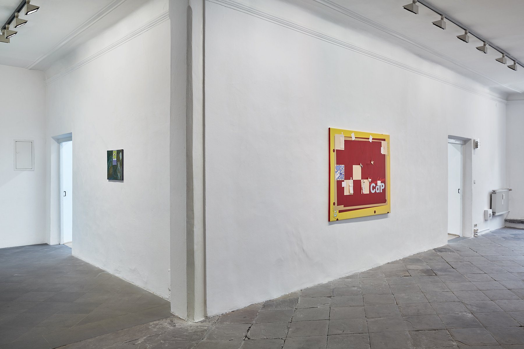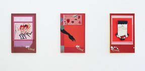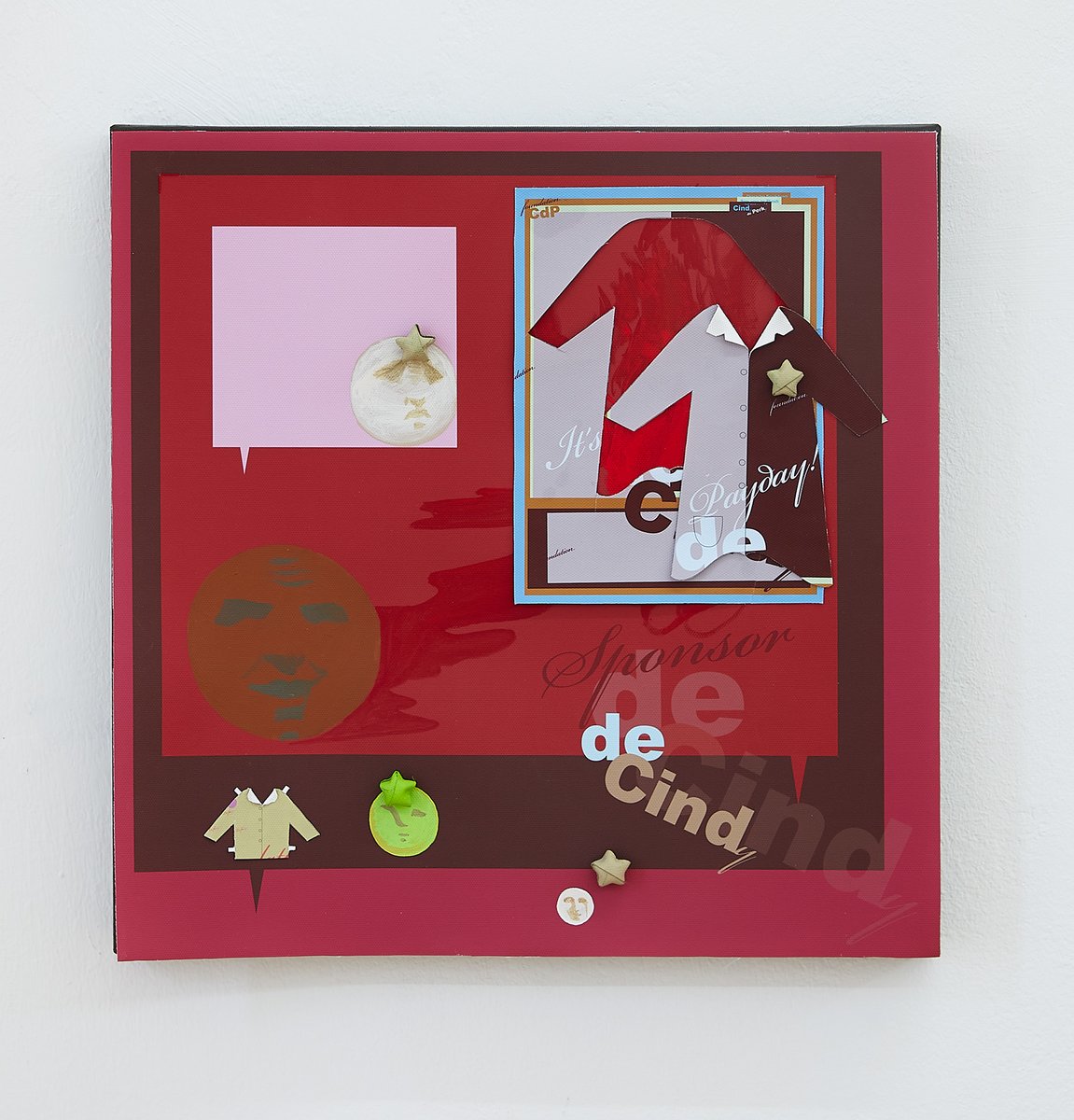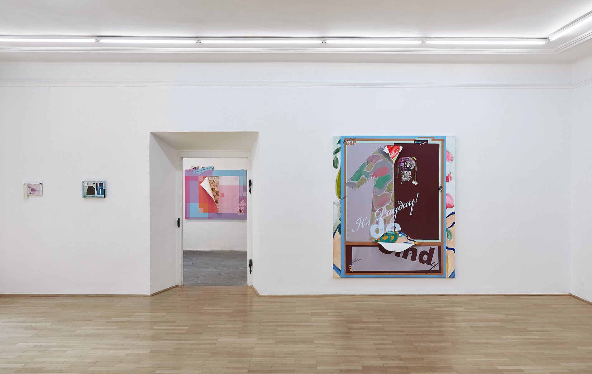 Probleme und ihre Lösungen, character breakdown und andere Mechanismen und Unwegbarkeiten des Storytelling, nicht zuletzt die, das hier buchstäblich etwas dahinter steckt, das auf einen Plot, auf eine mögliche Enthüllung hindeutet: In Seyoung Yoons neuesten Arbeiten sind bedruckte Leinwände auf Malereien platziert. Sie verbergen den gemalten Hintergrund und zugleich treten die verschiedenen Ebenen miteinander durch diverse Öffnungen und Bearbeitungen in Beziehung. Manuelle Eingriffe wie Schnitte, darauf gemalte Elemente und kleine Objekte unterbrechen die grafische Oberfläche, die Corporate Identity, und verkomplizieren so die Materialisierung einer Idee (die sich verkaufen lässt, die einen corporate Nutzen hat unter der corporate Oberfläche.