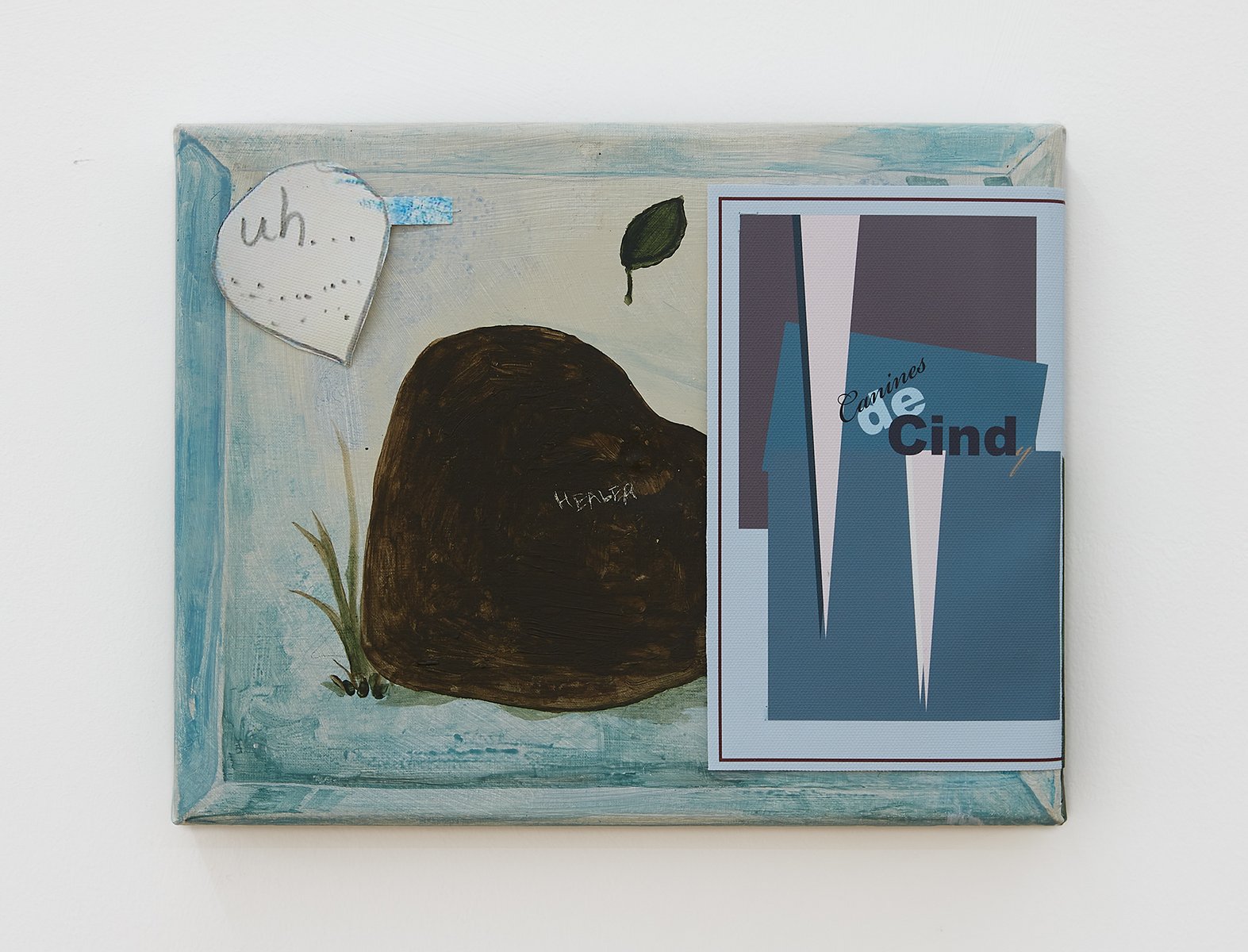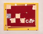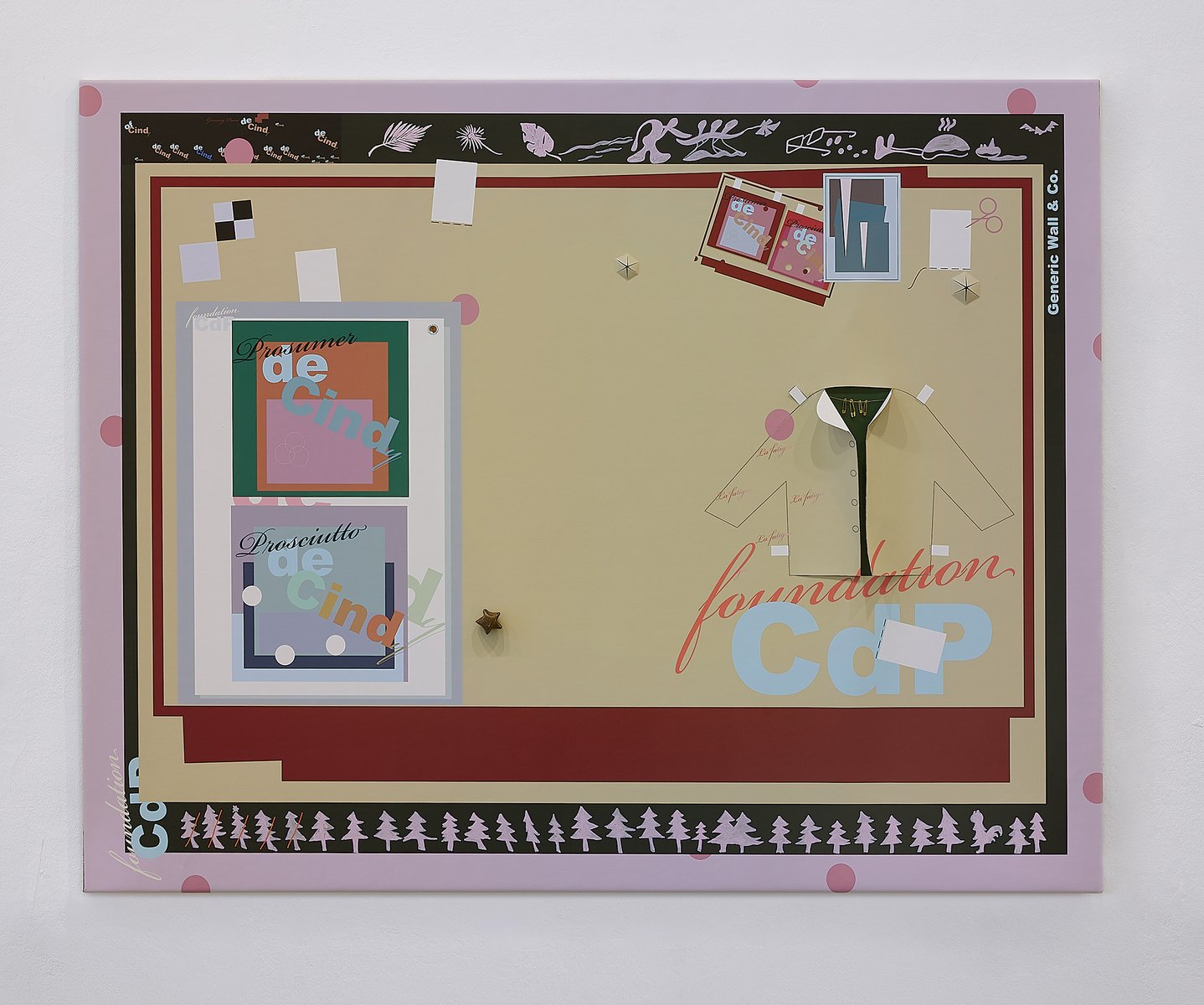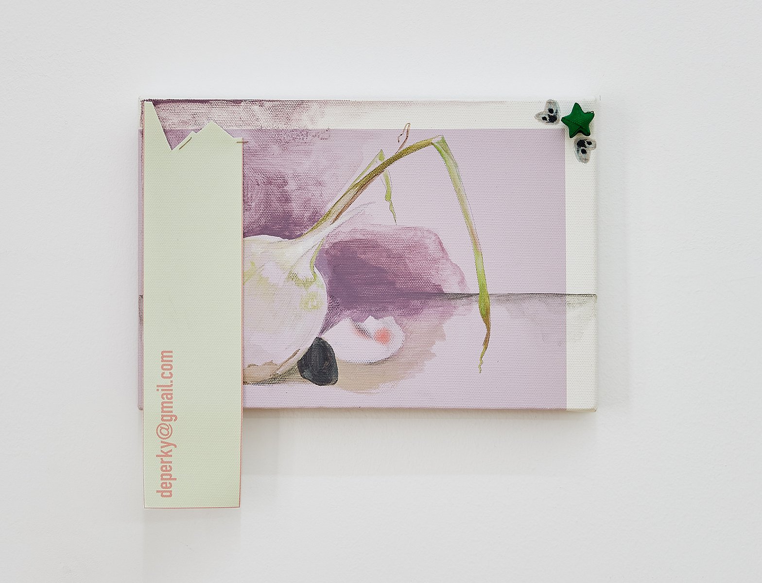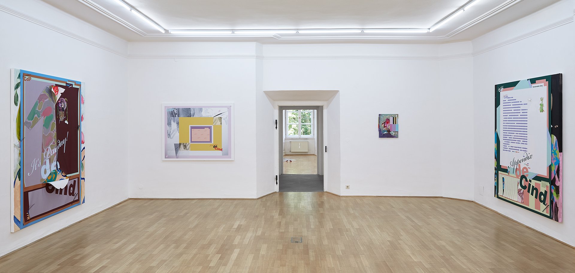 Probleme und ihre Lösungen, character breakdown und andere Mechanismen und Unwegbarkeiten des Storytelling, nicht zuletzt die, das hier buchstäblich etwas dahinter steckt, das auf einen Plot, auf eine mögliche Enthüllung hindeutet: In Seyoung Yoons neuesten Arbeiten sind bedruckte Leinwände auf Malereien platziert. Sie verbergen den gemalten Hintergrund und zugleich treten die verschiedenen Ebenen miteinander durch diverse Öffnungen und Bearbeitungen in Beziehung. Manuelle Eingriffe wie Schnitte, darauf gemalte Elemente und kleine Objekte unterbrechen die grafische Oberfläche, die Corporate Identity, und verkomplizieren so die Materialisierung einer Idee (die sich verkaufen lässt, die einen corporate Nutzen hat unter der corporate Oberfläche.