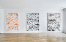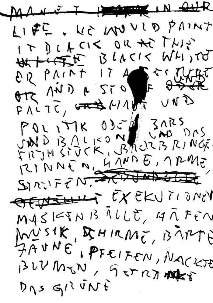 Sandners lakonische Notizen, die teilweise an Nachrichten oder Kommentare erinnern, die jemand auf Notizzetteln hinterlassen hat, sowie seine Wörter-Aneinanderreihungen, die sich mit historischen Kunstwerken oder emotionalen Zuständen befassen, kommentieren immer auch die Reproduktionsbedingungen bzw. das Arbeitsumfeld und den sozialen Zusammenhang, in dem sie entstehen.