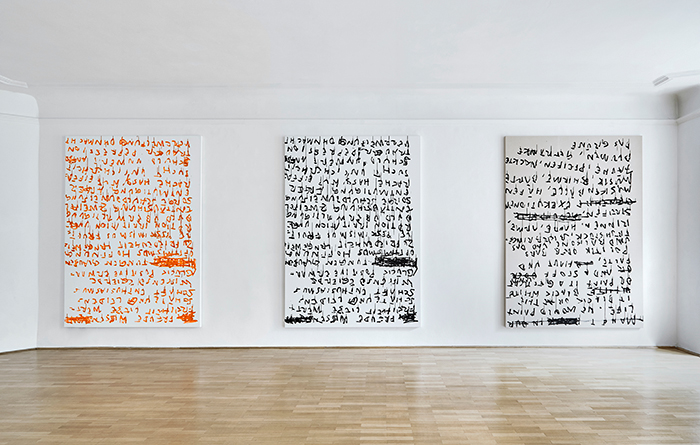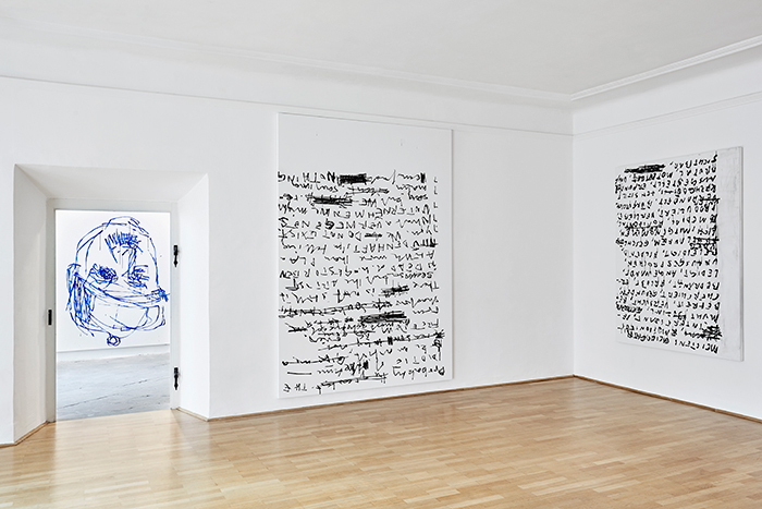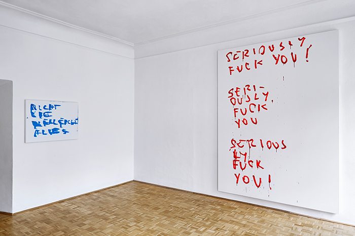 Indem Stefan Sandner die BetrachterInnen zugleich als LeserInnen adressiert, zelebriert er ein gekonntes Spiel mit Ironie und Witz, in dem die Betrachtung der Malerei als scheinbar Nebensächliches in Erscheinung tritt. Die riesigen Leinwand-Formate, die in ihren Dimensionen an die bedeutungsvolle Historienmalerei des 19. Jahrhunderts anknüpfen, stehen im absurden Gegensatz zu der Nichtigkeit der Informationen und der gekritzelten Form, in der sie notiert und gezeichnet sind. Der Pinsel wird zum Schreiben eingesetzt und mit der gewählten wässrigen Acrylfarbe hinterlässt Sandner oft Rinnspuren, die zum rhetorischen Vokabular und Pathos der abstrakten Malerei gehören.